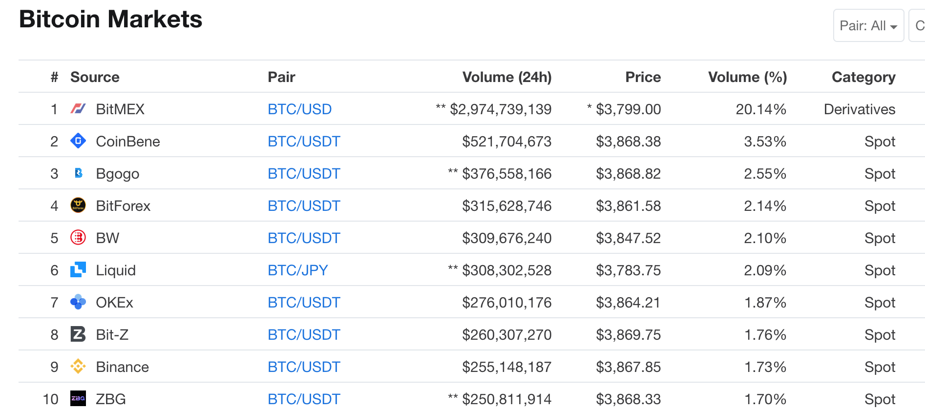 Bitcoin, at press time, was trading at $3876 recovering after hitting a low at $3853 [BTCUSD:BITFINEX]. Bitcoin plunged from trading at $4200 to the low price of $3800 in just under an hour. Heavy trading volumes from Bitmex, was reported by CoinMarketCap.