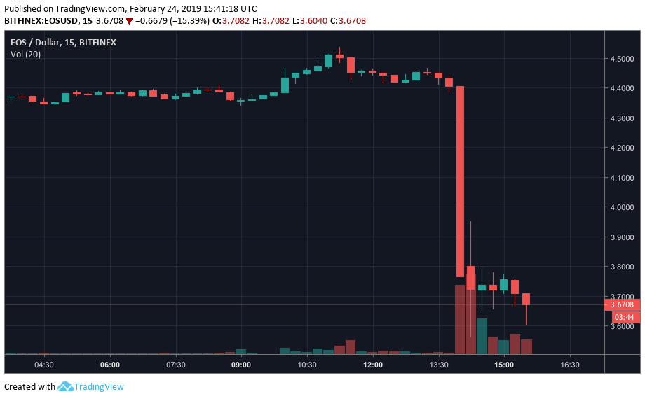 EOS, which saw a monumental growth over the past week, was infact trading at only $2.3/EOS at the beginning of this month. The mini-bull run past week saw EOS jumping to its 2019 high at $4.5 today right before the price started crashing.