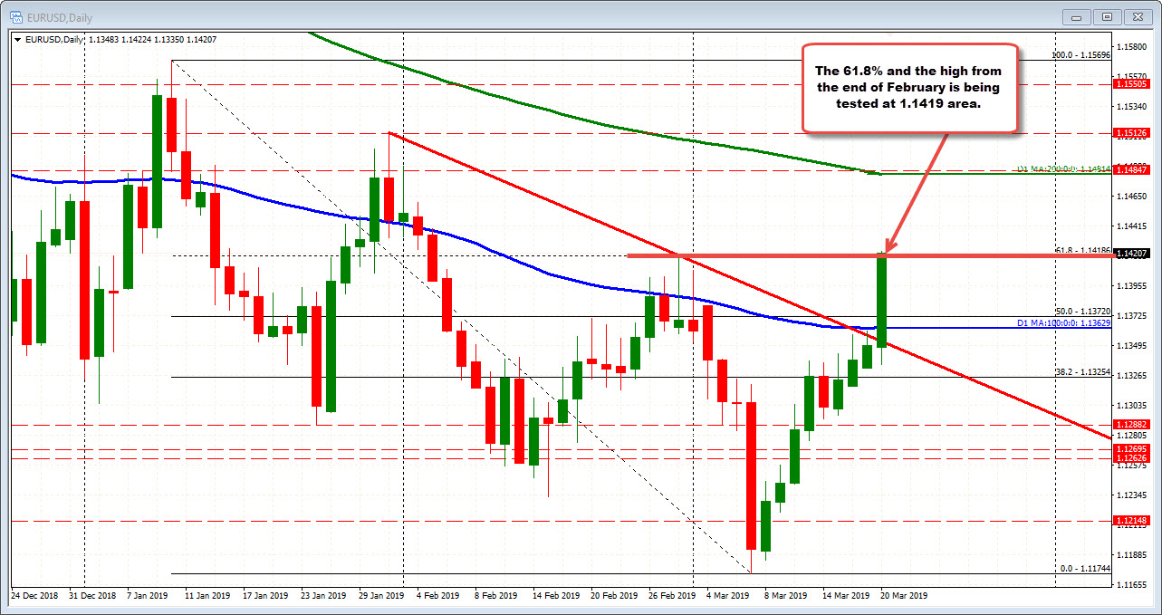 For the EURUSD, the price is up testing the 61.8% of the 2019 range and the end of February high (both are at 1.1419)