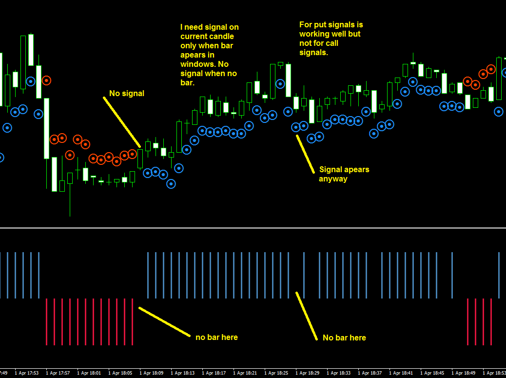 Hello Mrtools i need your help please, I trying to use this indicator with iCustom, I need a signal for up and down in current candle when bar apears in subwindows, no signal when no bar, My code work well for put but not for call signals whats wrrong? Thanks soo much in advance.