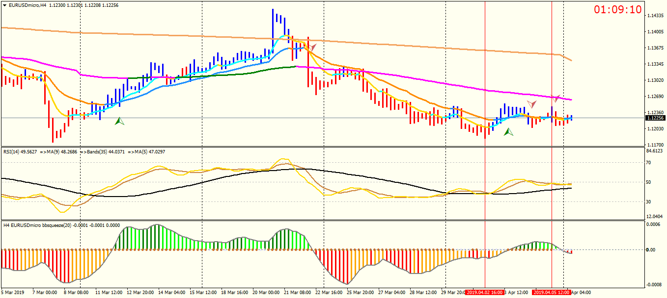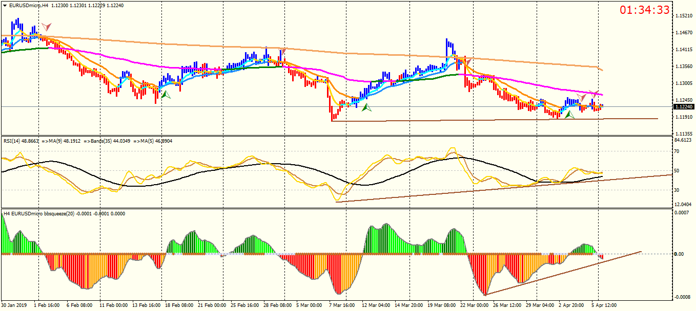H4 : chart does not show any obvious direction ,, last week's low 1.1150 and last week's high 1.1260 is very important levels not only at H4 TF but also at higher TF . RSI is above the bollinger band ,, but below the 50 CL ( center line ).If we draw a vertical line at those point we get the 1.1150 and 11260 .