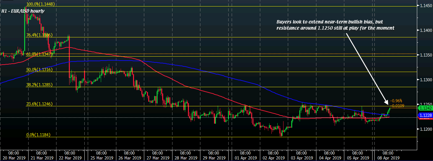 Buyers are surreptitiously establishing a more bullish near-term bias by holding above the key hourly moving averages and are now looking to push towards a test of the 1.1250 level. Last week's high of 1.1255 will also be a key resistance region to look at alongside decent-sized expiries today rolling off at the 1.1260 level.