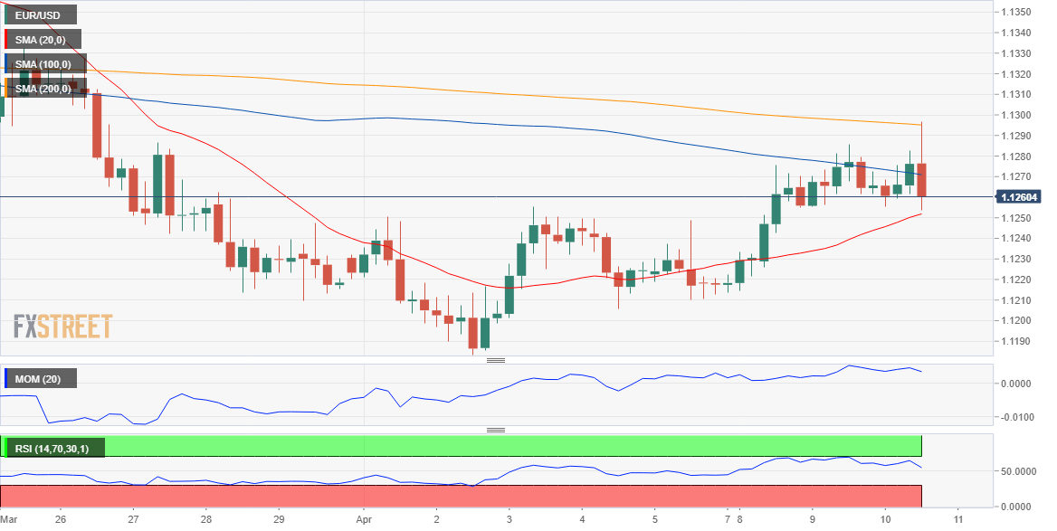 The EUR/USD pair traded between 1.1255 an 1.1281 ahead of the ECB monetary policy's outcome, barely reacting to the central bank's announcement, as it left rates unchanged as anticipated. There was no mention to the TLTROs in the accompanying statement, but market players were already aware that details on those would likely be out next June. The pair later peaked at 1.1287, following the release of US inflation. According to the official report, March CPI rose by 0.4% MoM and by 1.9% YoY, surpassing the market's expectations. However, core yearly CPI resulted at 2.0%, below the previous and the expected 2.1%.