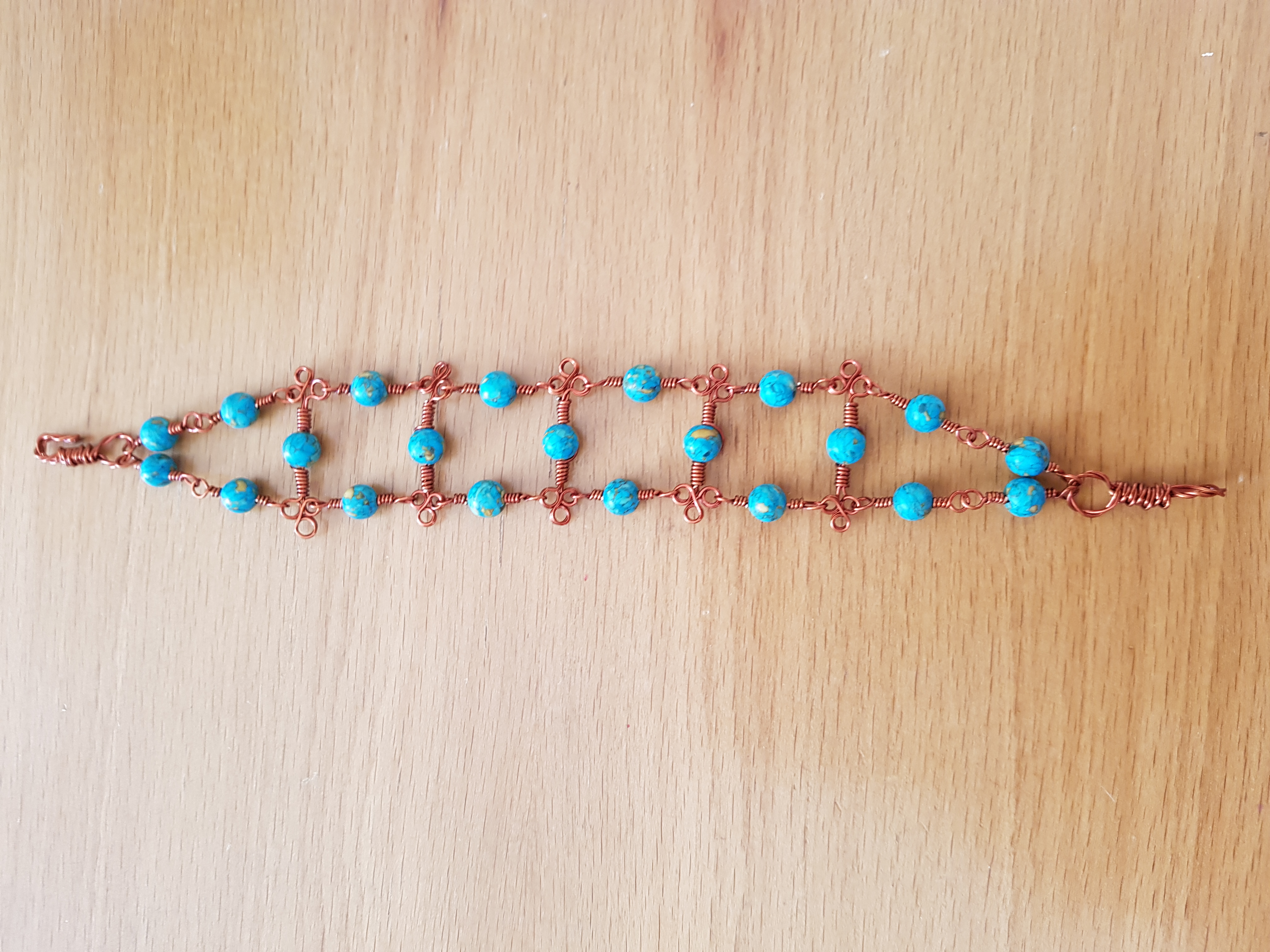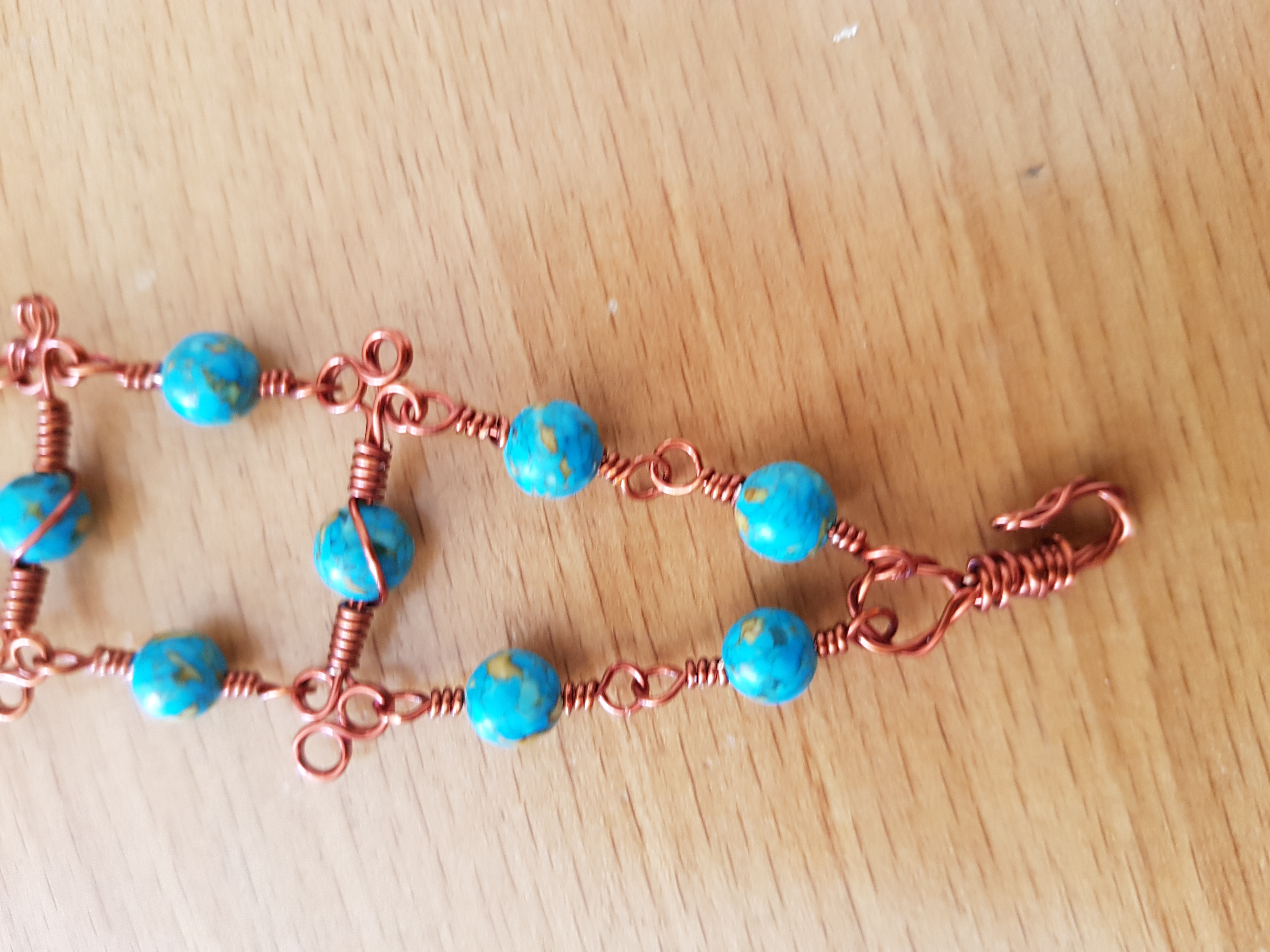 Copper wire , resin beads in persian blue color ,