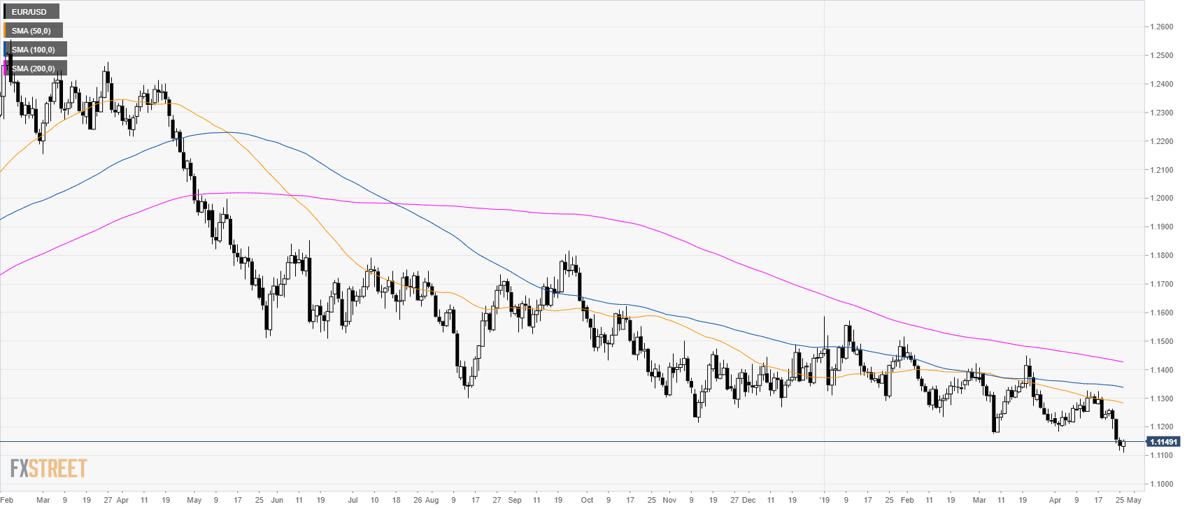 - EUR/USD is trading in a bear trend below its main simple moving average (SMAs).