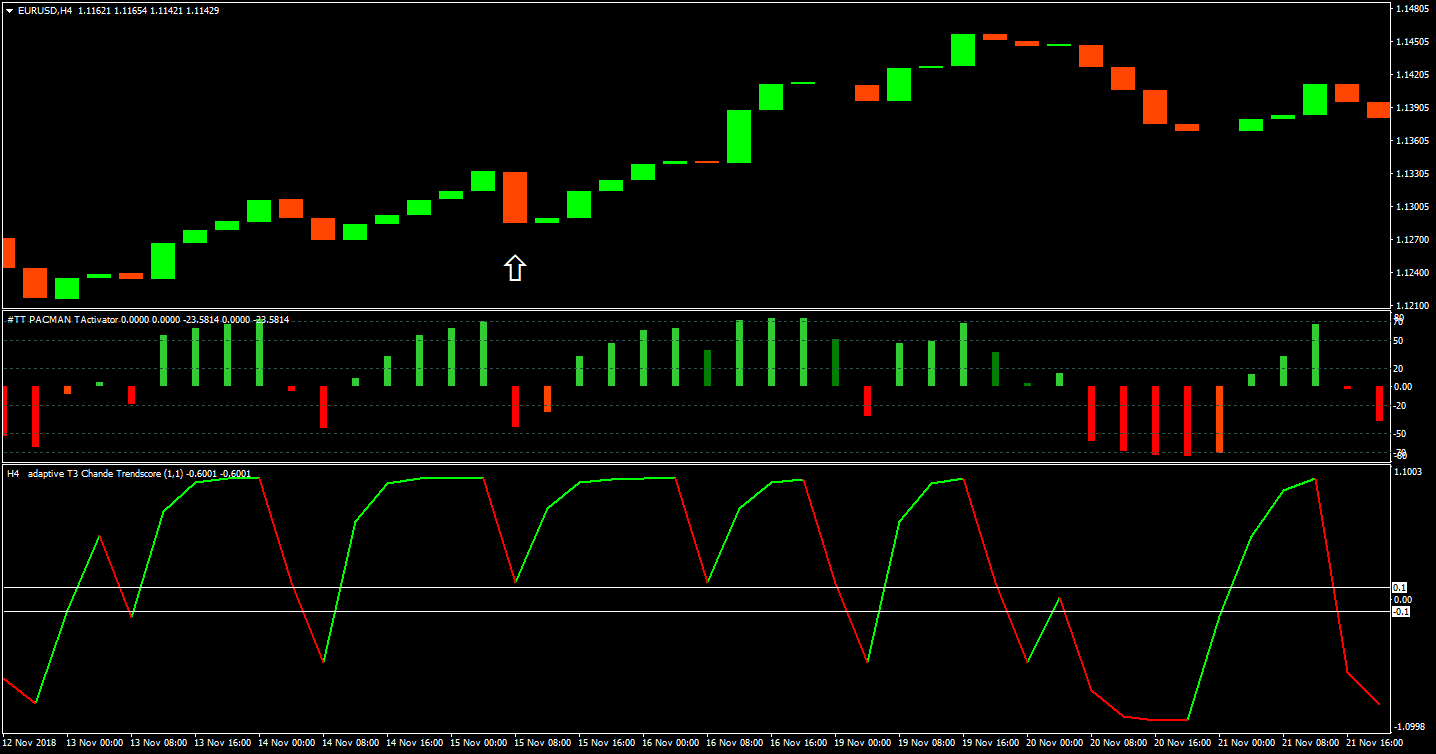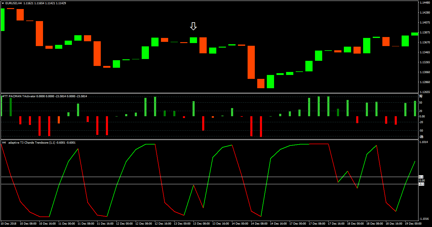 Vica versa - - if adaptiveT3chandes close below the -0.1 line and at the same time Pacman displays a green candle, then the next Candle Sell.