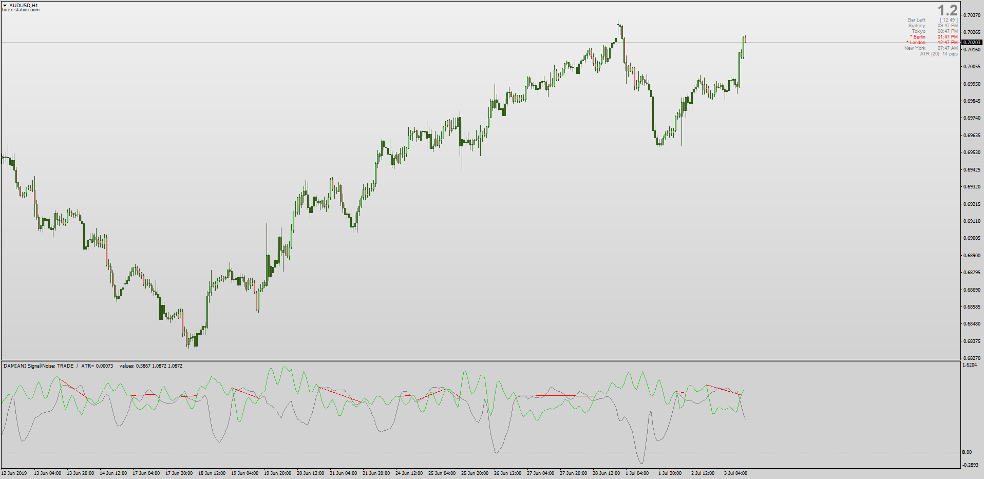- When the Green line is ABOVE the gray line, this signals strong volatility and trending markets. Trades into the direction of the trend are permitted