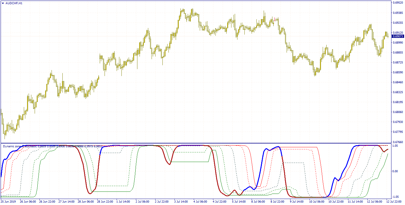 This is a double dynamic zone inverse fisher transform of stochastic. The stochastic coloring is on crossing the dynamic zone zero (center) line.
