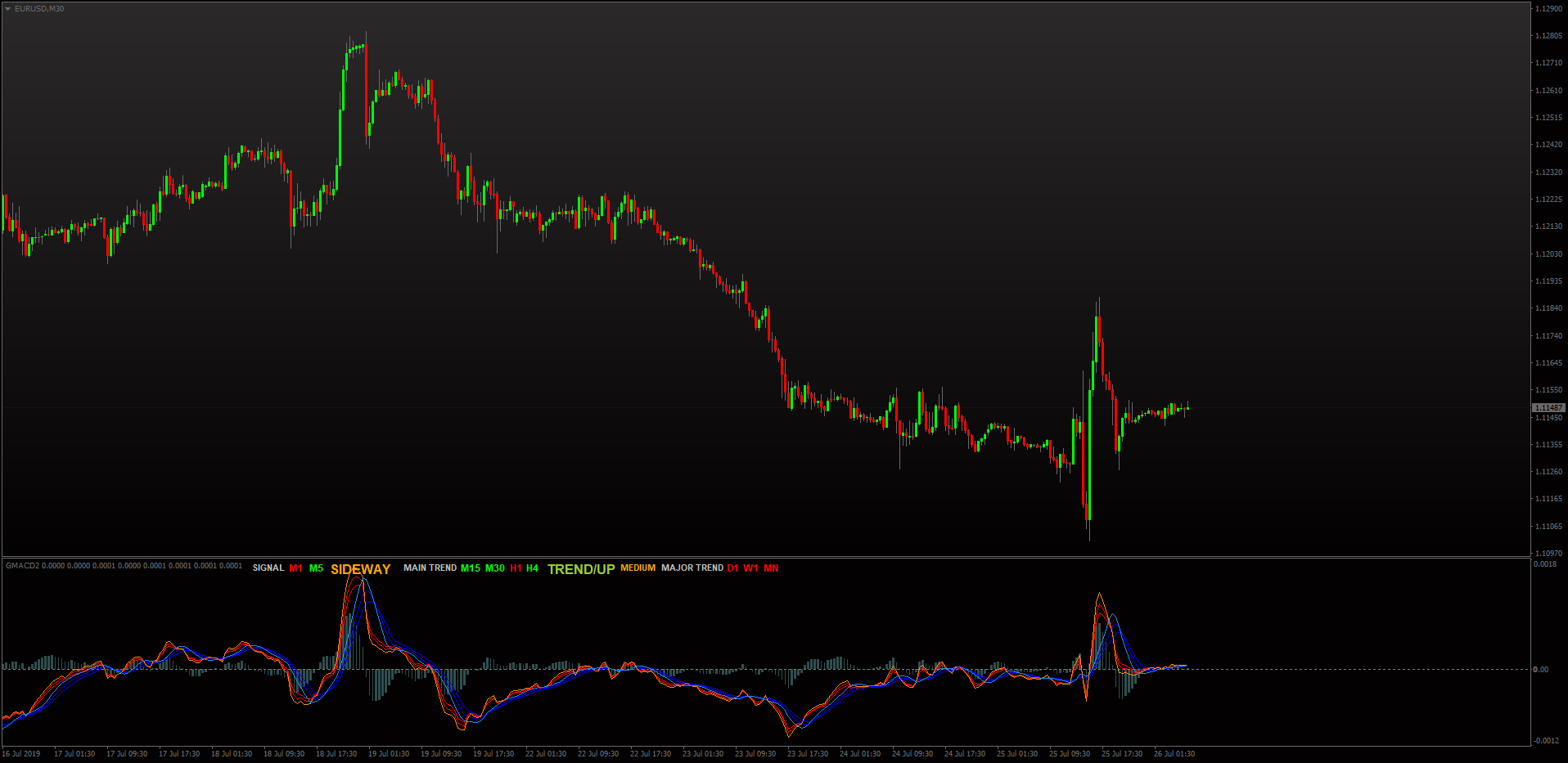 This is the GMACD which features a trend display panel and is another interesting one from the TSD days. It was later optimized by Mrtools & Mladen and was a superb version of the MACD for it's time.