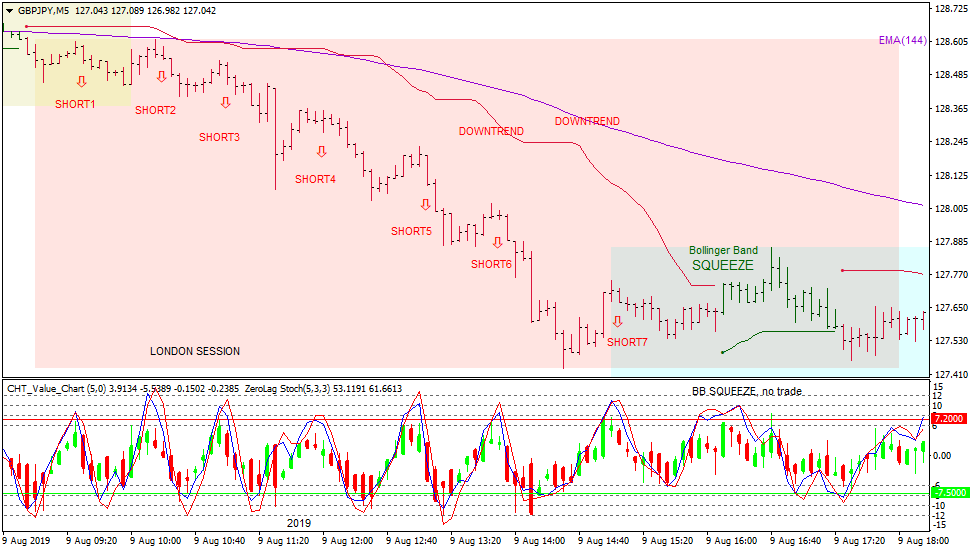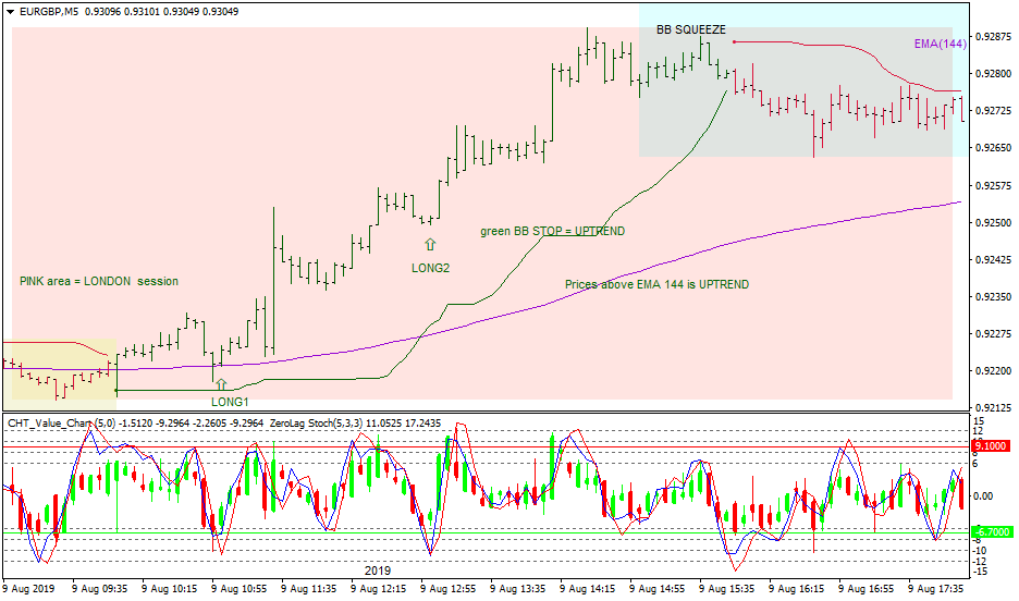 Chart: M5This indicator is not designed to be traded alone in fact it works great as an addition to an existing strategy. For example using the Value chart with the Zero Lag Stochastic set to 5,3,3. If you don't have Zero Lag Stochastic you can use a standard stochastic set to 3,3,5. when the Stochastic crosses above the 80 level and the Value chart is between 8 and 10 consider a sell or if the stochastic is crossing below 20 and headed up and the Value Chart is between -8 and -10 then consider a buy. I trade 60s Binary options with this strategy and it works great.
