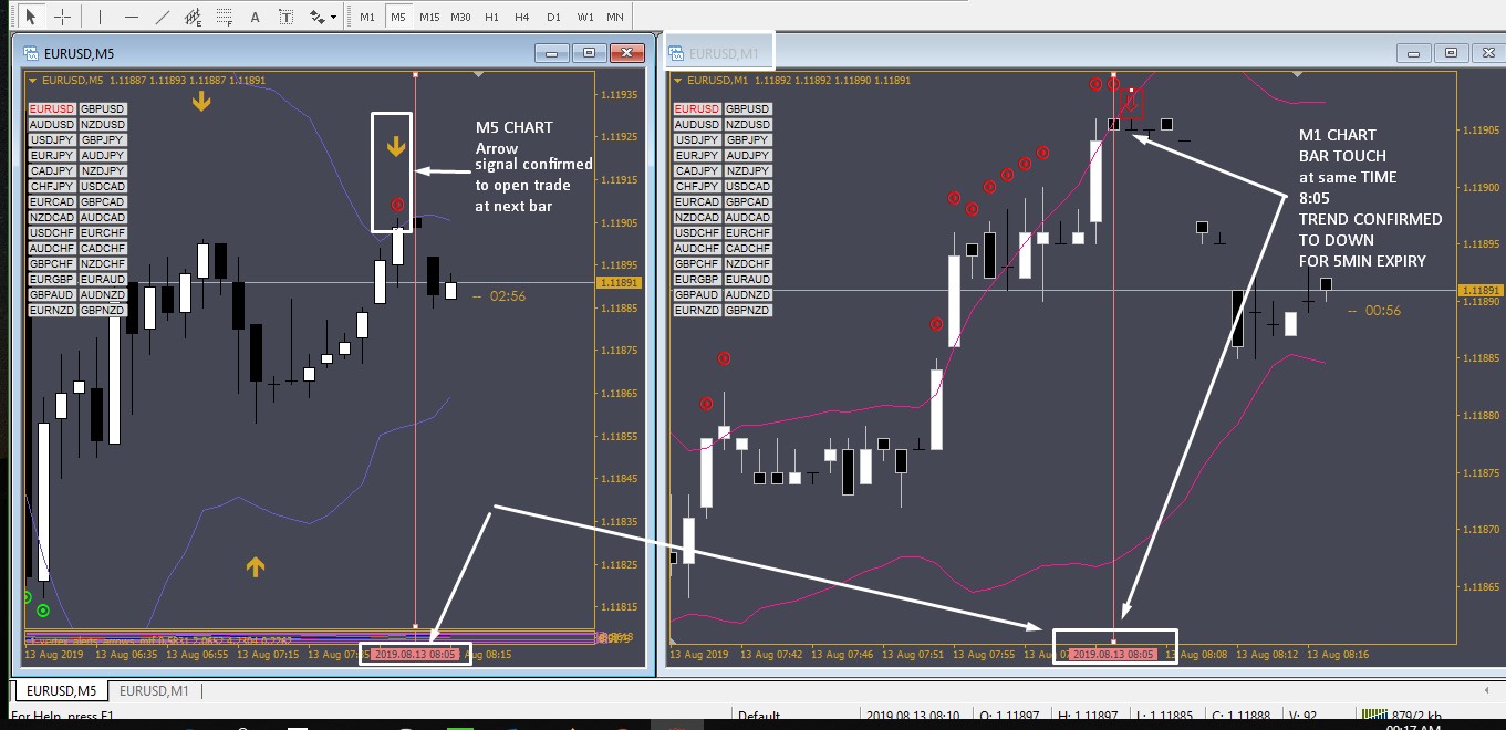 2. M1 chart BAR touch at BB bottom line at same time of M5 CHART