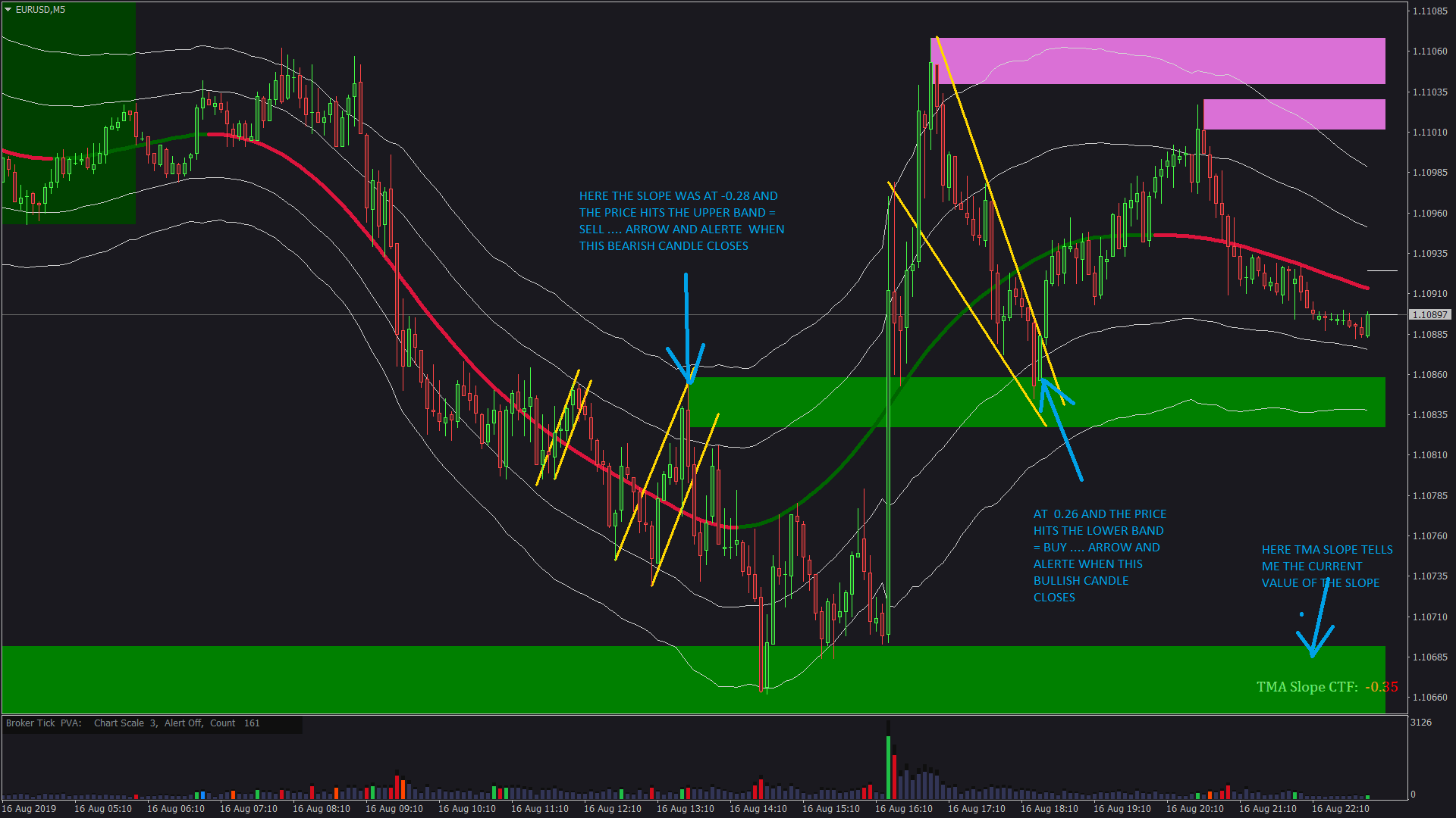 Hi MR TOOLS Hello everyone I'm sorry for my English, I'm sorry to bother you, but I really need your help, I'm using the TMA centered band using an adaptive atr calculation in the bands. The adaptive comes from Perry Kaufman's efficiency ratio to calculate the true adaptive range. , published by MR TOOLS on page 27 of this thread but I do not have the mql4 file. I would like you to modify this version of the TMA in such a way that it calculates the current slope of the price and gives alerts and arrows that only in the current direction of the slope when the price reaches the lower bands or superior . The minimum value for an alert and an arrow when the slope touches the top band is -0.25, and 0.25 when the price touches the lower bands. The alert and the arrow will appear when the first turning candles close, please add the option to change the minimum value of the slope to display alerts and arrows in the parameters. the tma centred bands mtf uses two bands, the same parameters will apply to both bands, one last thing please add an algorithm to display the value of the slope in real time of the tma centred bands mtf with parameters allowing to adjust