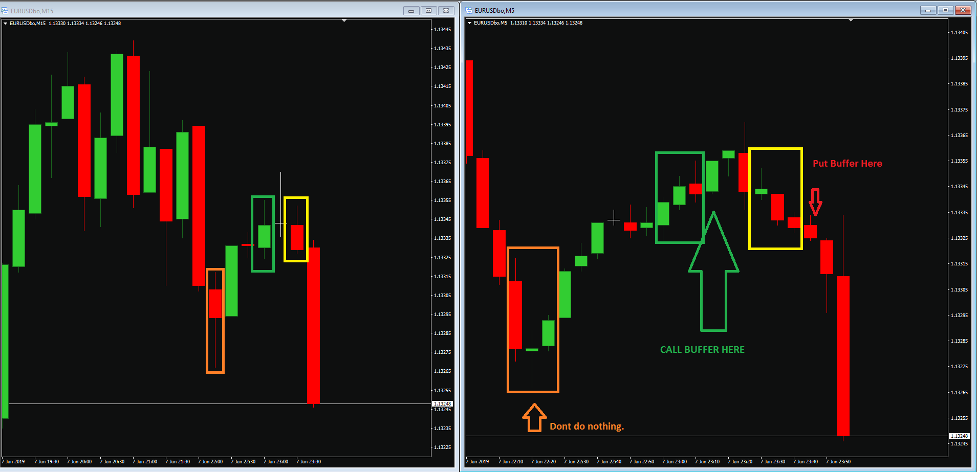 The logic is simple. If the M15 candle close green (Bullish), check if the 3 m5 candle who made that m15 candle, is majority bull, if yes, do a call buffer on the next m5 candle, if the majority is bear candles, do nothing, if the number are the same (bull, doji, bear), do nothing.