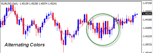 Alternating colors are a sign of strong indecision. At this point, anything can happen. The market could take off in any direction with little or no warning.