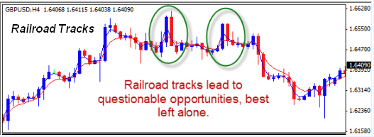 Railroad Tracks are a set of 2 candles next to one another. They are longer than average and they both are different color. The market shot up and then right back down again, or bolted down only to immediately rebound. This is often fundamentally driven, and often there is something more to follow. This is an element of “oops, we made a mistake” by the market participants. From here, things can get tricky.