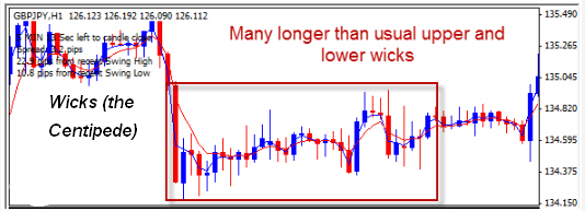 These wicks will look like the legs of a centipede. During this phase, the market can wander up wards, downwards or just sideways. In any direction, there is still an undecided direction in the market. The bulls and the bears are fighting it out and they are equally strong. Knowing who will give up first is difficult, as it could be anybody’s game.