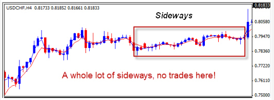 In the above example, you see the USDCHF doing absolutely nothing at all. At this point, there is no battle between the bulls and the bears, they are content to have picnics and campfires. You can try to provoke them by placing a trade, but they will most likely just ignore you.