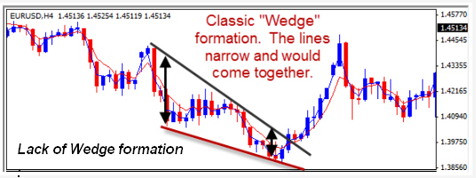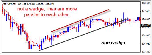 The wedge is depicted when a trend line and the divergence line look to be coming together. If you were to extrapolate the two lines, they would come merge in the distance. The opposite of this is when the two lines are extrapolated, they would either stay parallel to each other or move apart from one another. The example below shows a separation of the lines rather than a coming together. A non wedge formation.