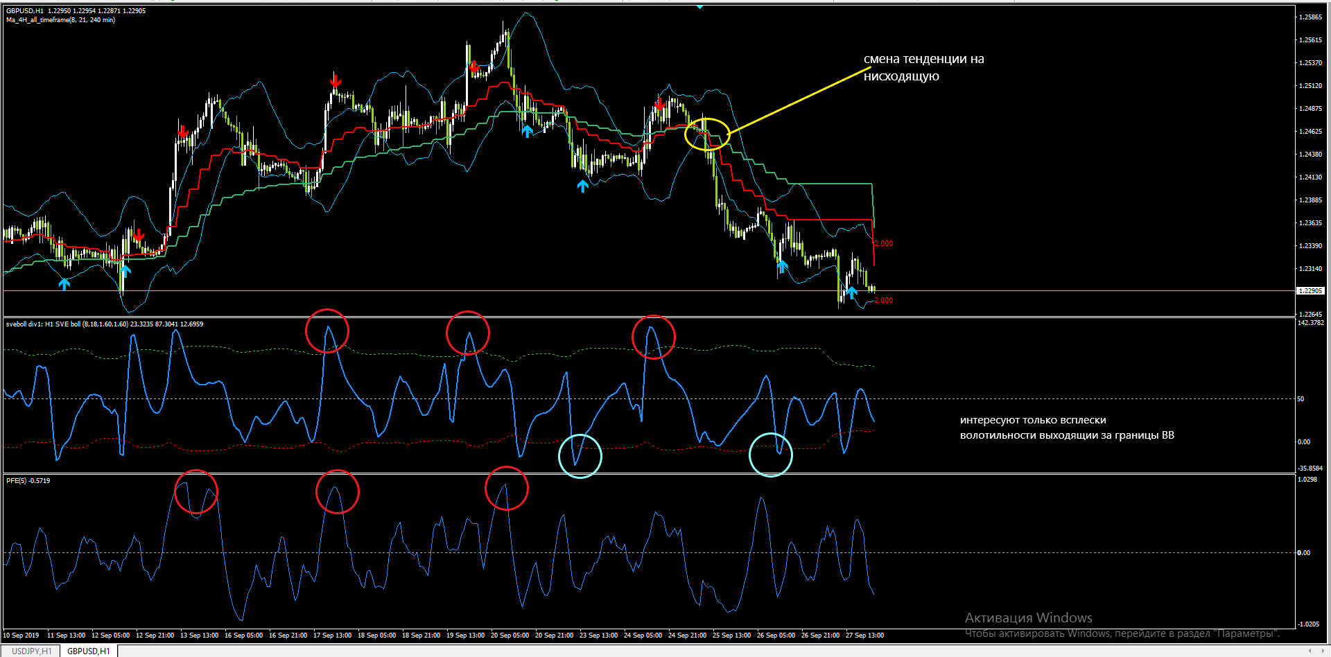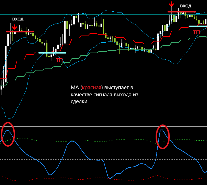 Hi, a simple TS is counter-trending, so you need to be extremely careful and always work with stops, we monitor the bursts of volatility on the oscillators in the basement and the breakdown of the ATP channel on the main screen, in aggregate, these signals make it possible to roll back and take profit to the signal MA ( red color). There is also the opportunity to work on a trend, a change of trend occurs after the intersection of two cars (MA) red and green and, accordingly, the input on a surge in volatility after the intersection on the basement indie, exit from the transaction, the reverse intersection of MA, everything is simple, it’s better to trade on higher frames from H1.
