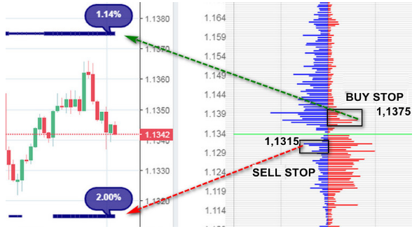 Two lines on the chart are located above and below the current exchange rate of the currency pair at the highest maximum price value of stop loss, selected from the area of ​​7 values ​​of Sell Stop and Buy Stop. Such an algorithm allows you to choose a strong level on the principle of the mutual influence of orders in a cluster on each other and to avoid the factor of false, “phantom” volumes - traps of a market maker.