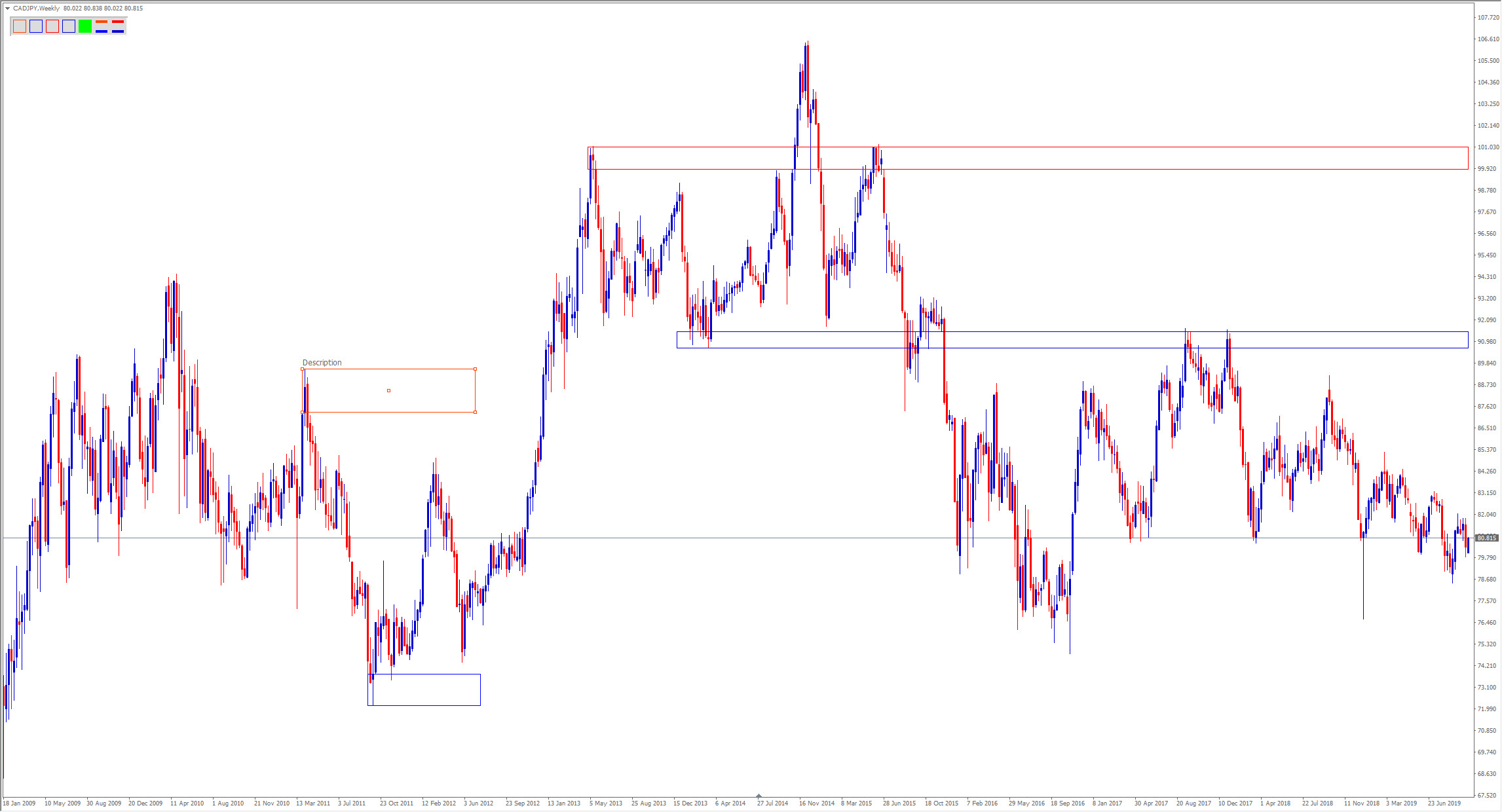 this is an indicator to speed up the process of drawing S&D zones. The two leftmost Icons simply create rectangles in their specified color. The two icons to the right create rectangles that are automatically dragged into the future, so you can allways see price reacting to them. The same is true for the two rightmost icons. They draw horizontal lines. The indicator also has an alarm feature.