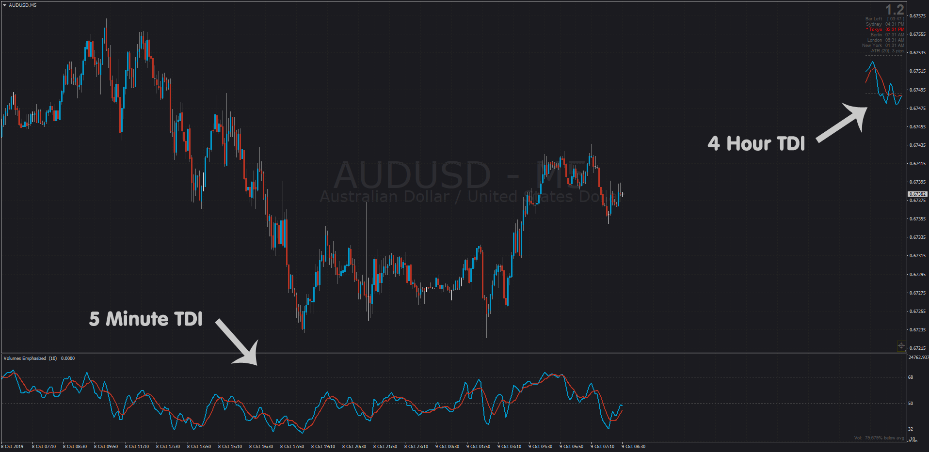 In the chart below, you would take the 5 Minute chart's TDI trades into the 4 hour TDI's signal by using the Floating Indicator and MTF.