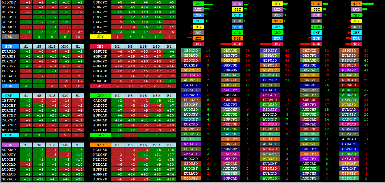If it could show all currencies simultaneously and have the option to select up to 5 or 7 selectable TFs and have alerts like push/mobile, email, that would be the ultimate meter. I do manual profiling and it helps me in my trading decision seeing which currency is the strongest/weakest. I have yet to see an accurate strength meter that mirrors what I do manually. However, if we had a meter that was based on a 2MA cross, ADX or Absolute Histogram with editable parameters, that would be a superior indicator. Below is an example of my profiling and Maddash indicator as an example of how it could look or just have meters that show the MTF's. By the way, it doesn't have to look elaborate as the MadDash. The groups with strength metering is suffice.