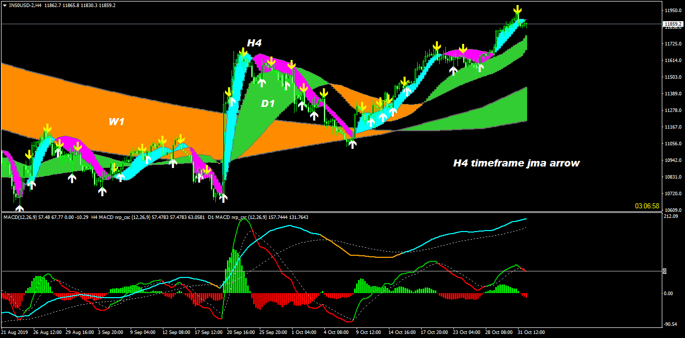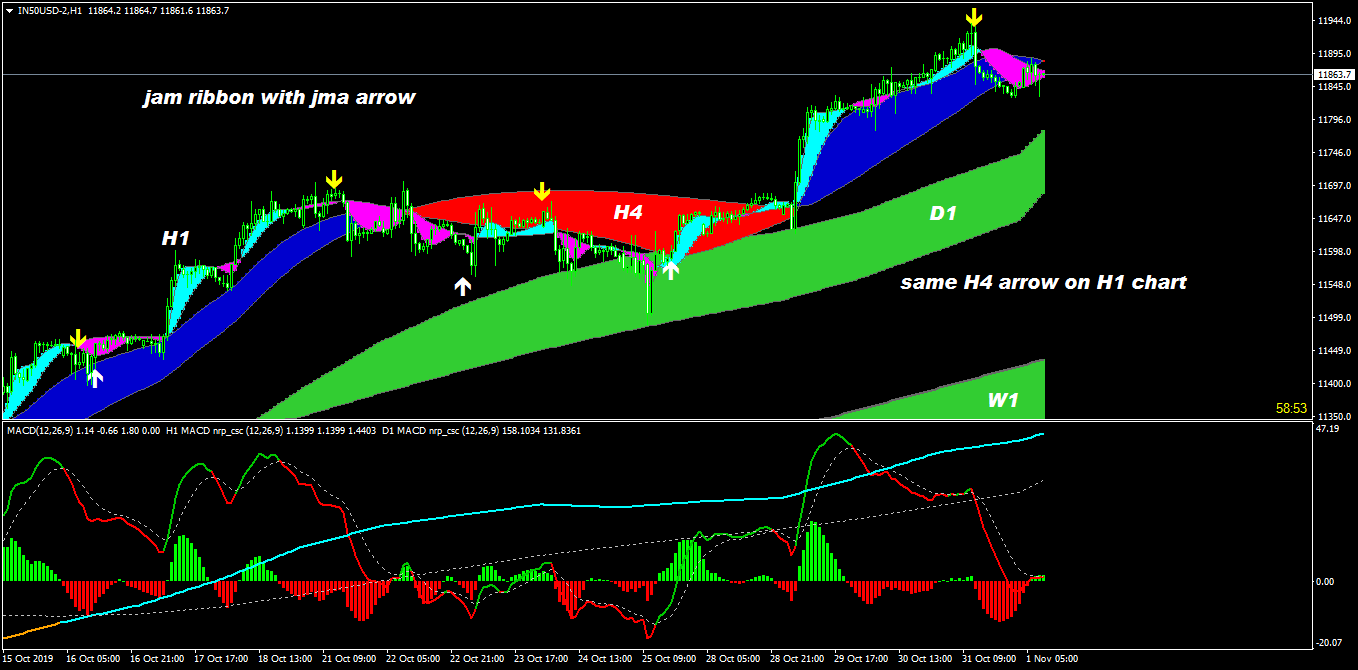 -Jma ribbon is for seeing start and end of whole swing, arrows are for entry and exit for in between retracements for entry on lower timeframes. so posted here example for H4,H1 timeframes in image and on templet.