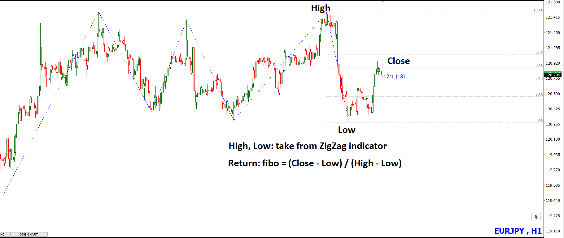 I want define the fibonacci position of the current price compared to the zigzag line.