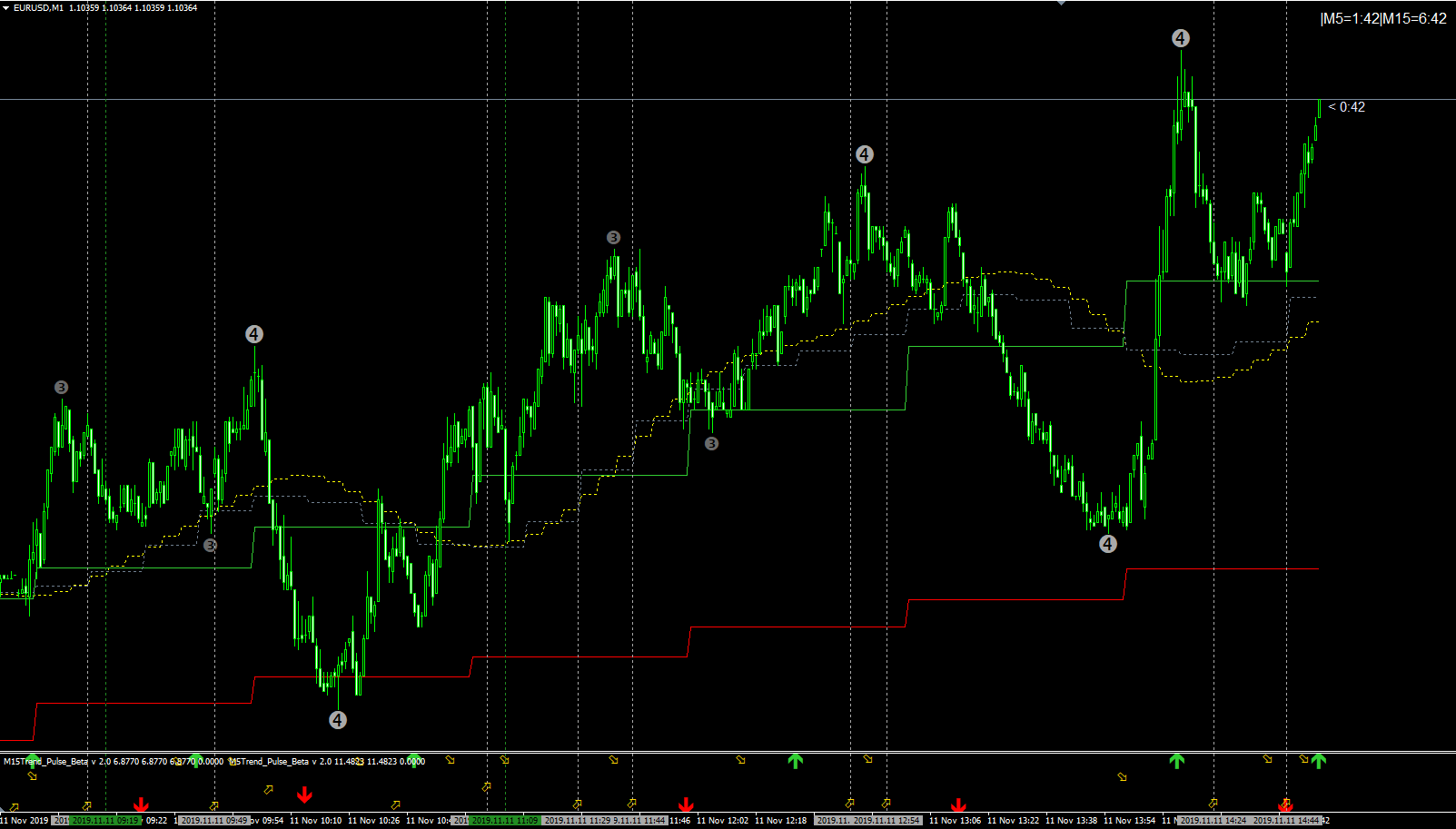 7 Hours - Diff. setup using channel lines(5 min, 15min close price and 1 hr high/low price) but signaling stayed the same.