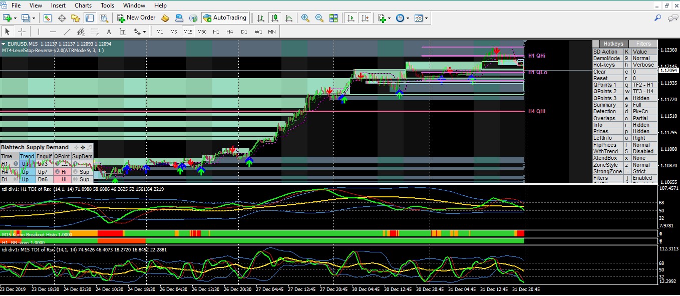 Here's my default view: Two TDIs, a paid for Supply & Demand (different than support & resistance) indicator, and a few histograms.