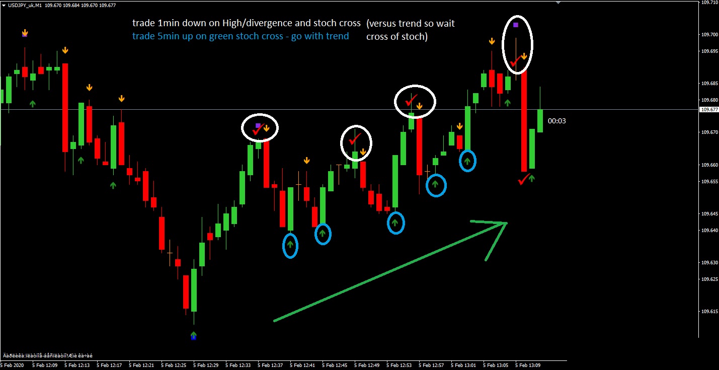 purple+orange arrows outside tma band - take 5min/5candle expiry.