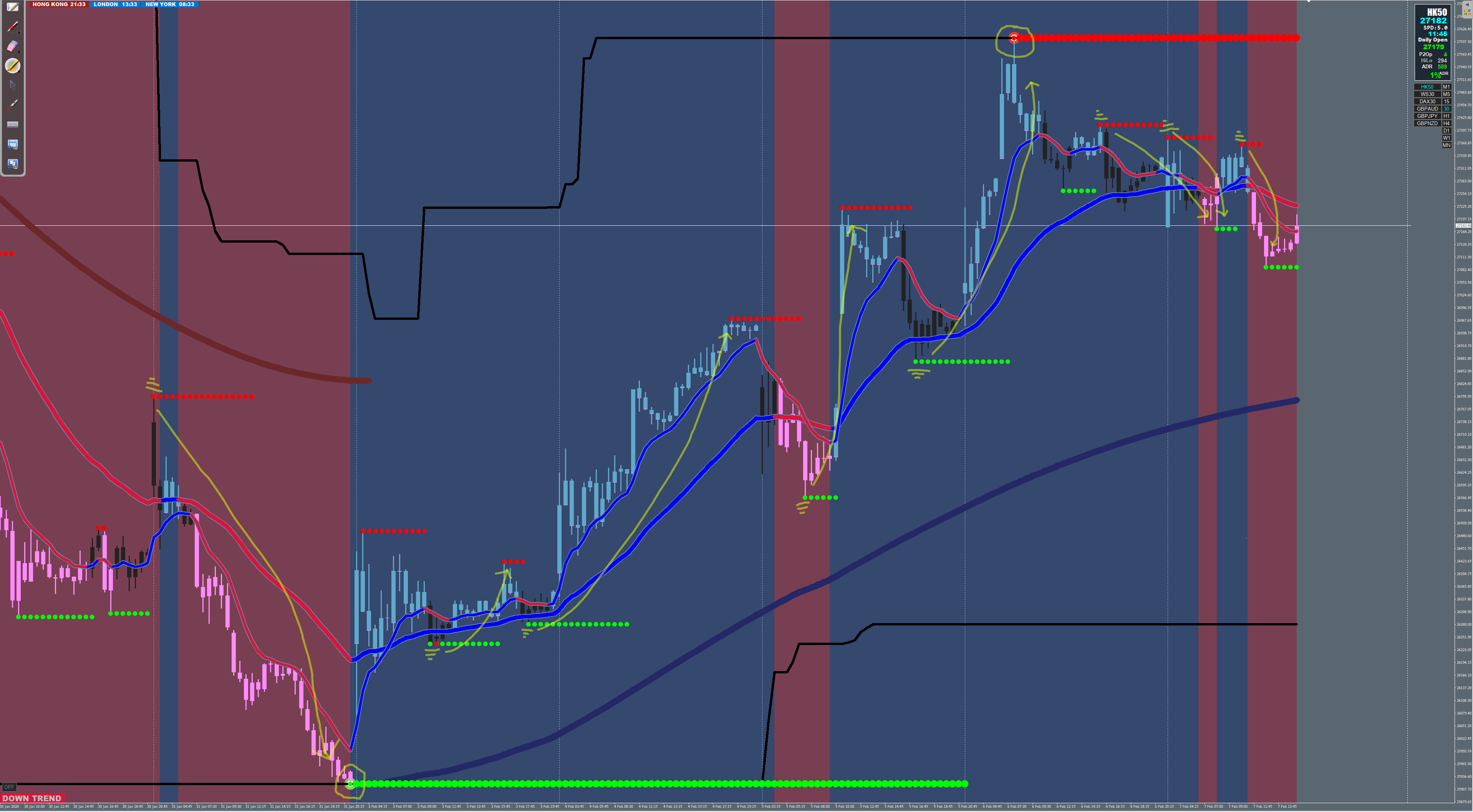 Here is a 30 Min chart of HK50 showing SELL & BUY entries on the 5 min Dots.