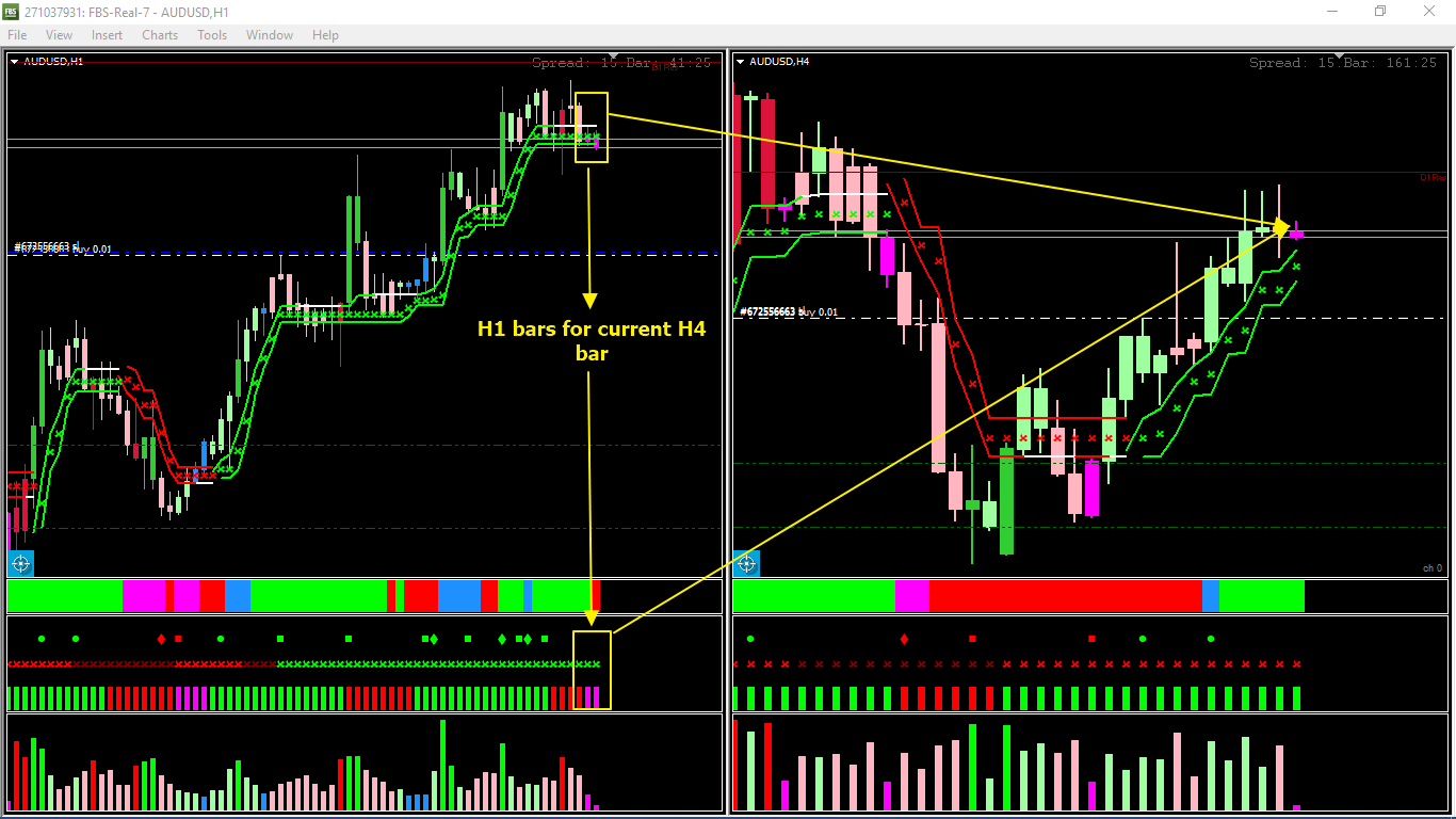 The indicator below the heatmap accesses a predefined higher timeframe and shows the status of my indicators through iCustom on a lower timeframe,