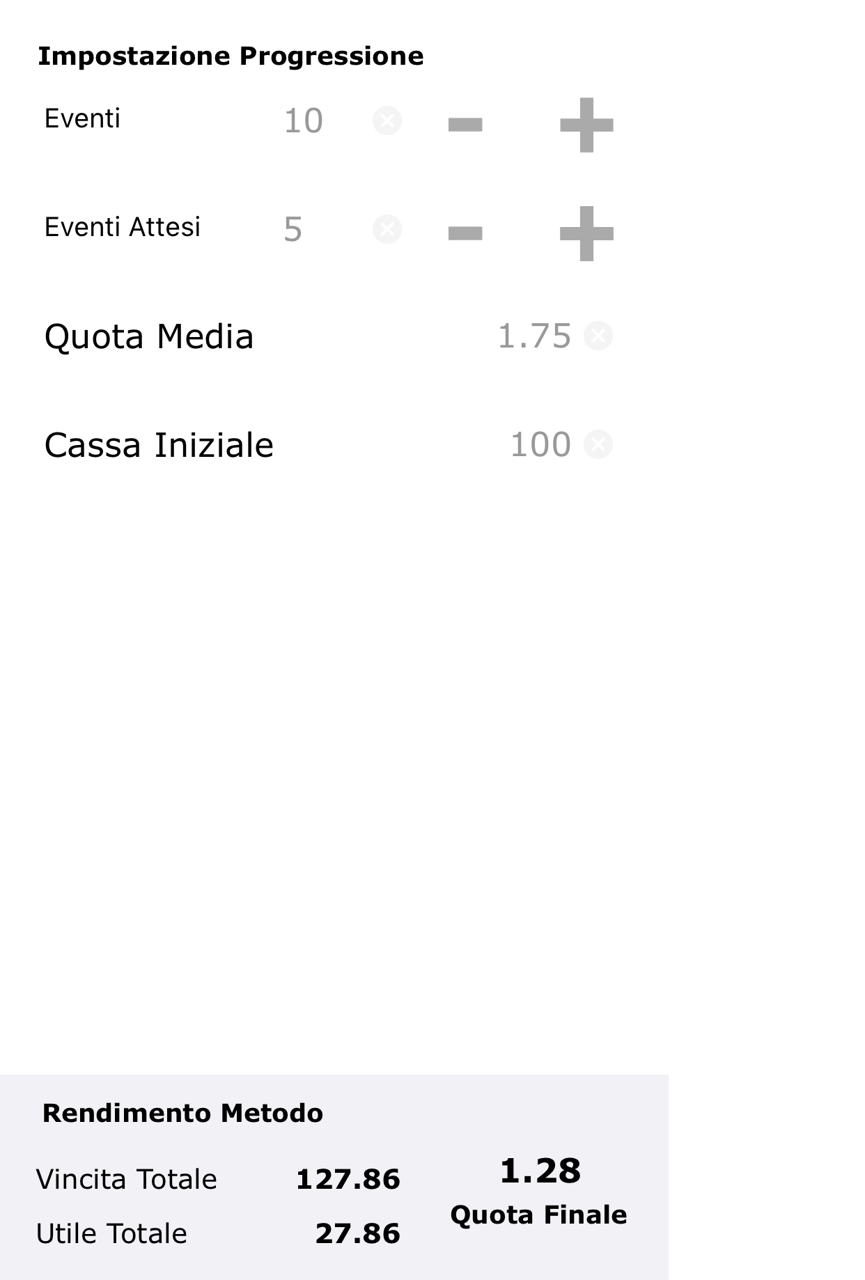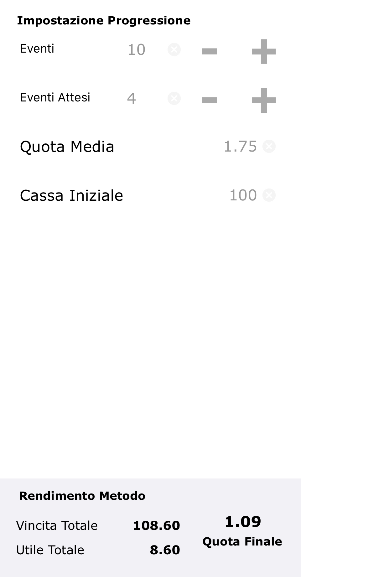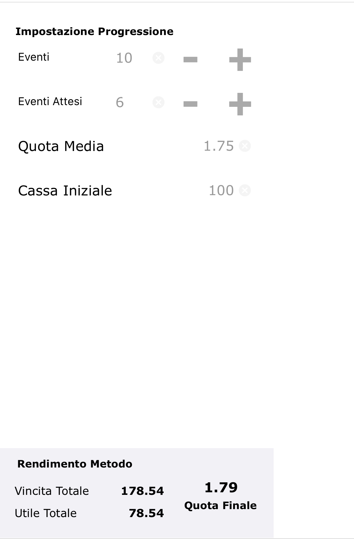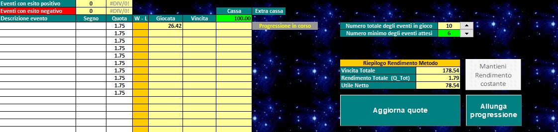 In the "Quota" column then, write 1.75 and drag up to 10 boxes. Automatically the field on the right "Numero totale degli eventi in gioco", will change giving you 10 operations (or the number you have decided). The second step is to set the minimum amount of corrects trades that you plan to hit based on the total number of maximum trades we intend to open. I propose 6 exact trades and then in the "Numero minimo degli eventi attesi" tab, use the arrows to enter the number 6 (or whatever number you decide).