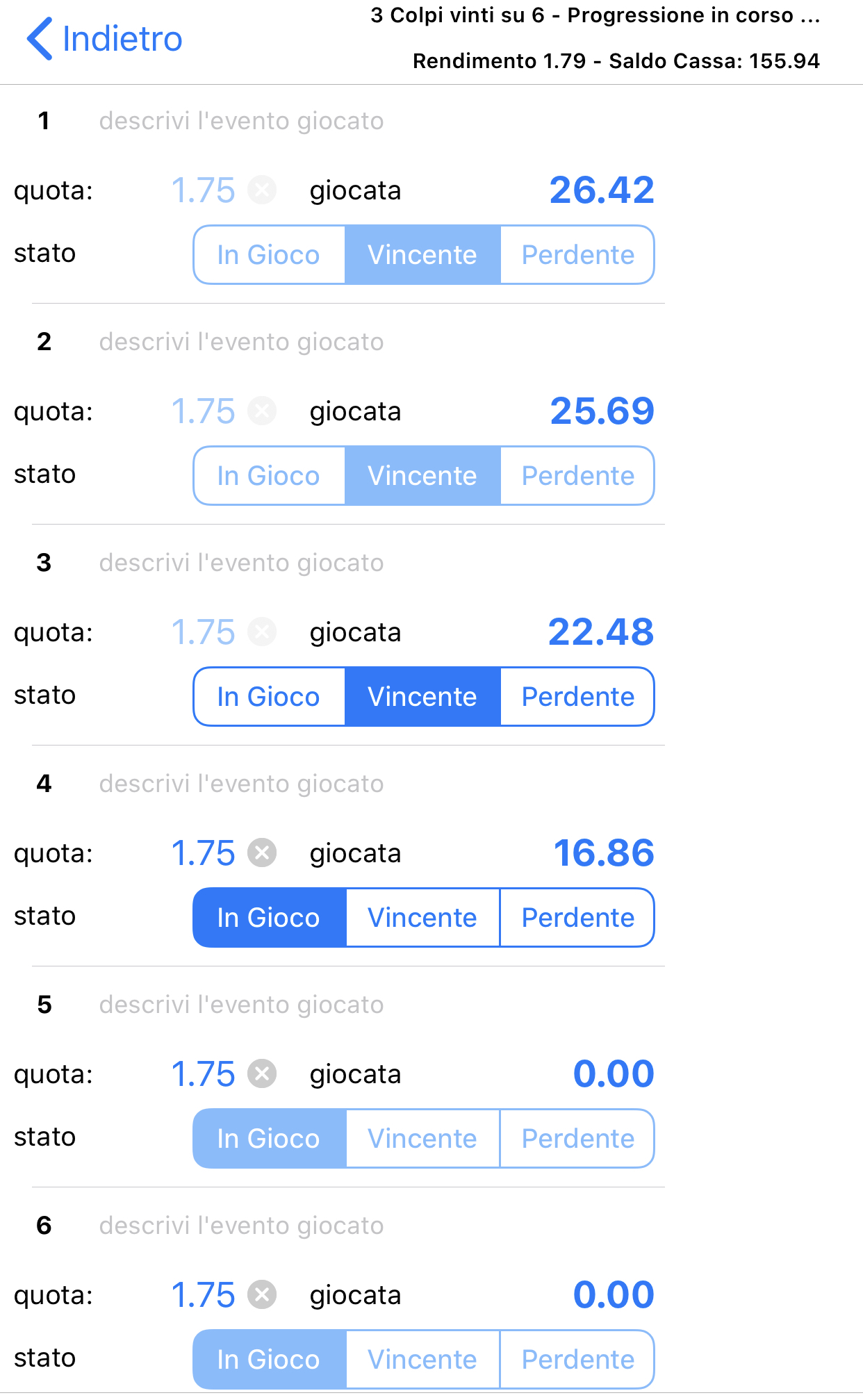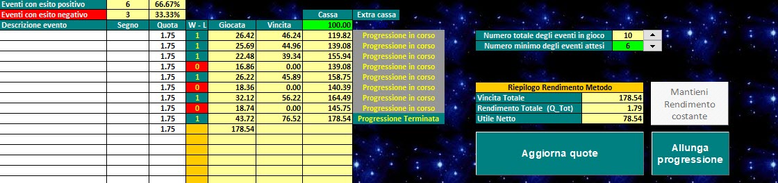 Having reached the target of 6 win, the progression ends and Masaniello ended with a net profit of 78.54 euros, which is equivalent to the 79% shown at the beginning.