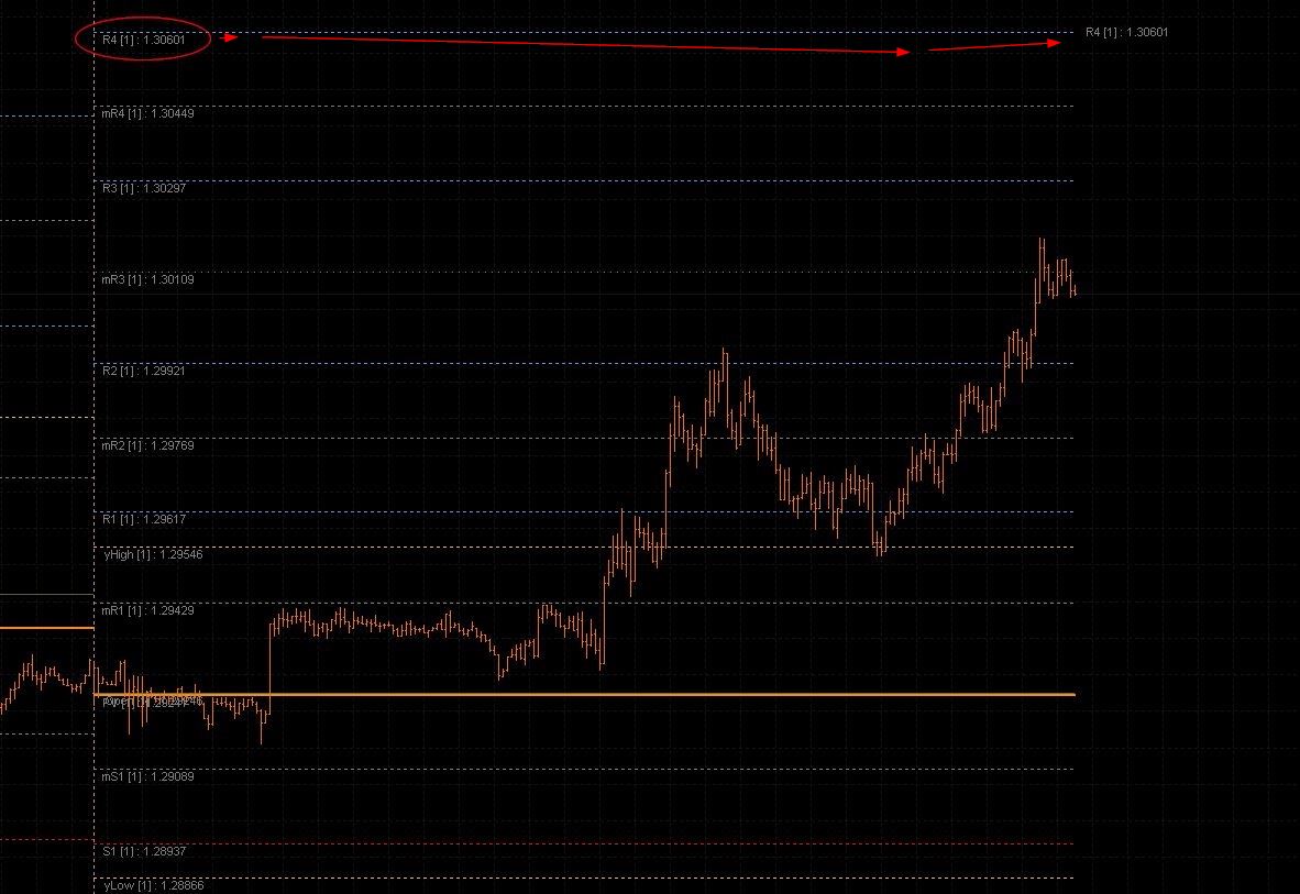 I need help from a coder, I would like to ask if possible on the indicator SDK-Pivots-nmc.mq4, by default, the labels stay attached to the left anchored to the start of the day. I would like to have possibility to move the labels to the end of the line as per the chart attached. The main reason is when trading M1 the labels are no longer visible and it's difficult to figure at a glance wich line is what.