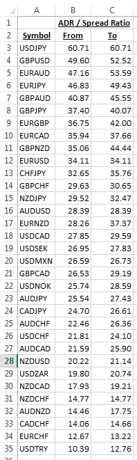 XARD: I do not have a similar list of market movers for indices or commodities but it is fairly easy to great. Just load up each index or commodity and take note of the ADR value in the top right info panel then list them in descending order of Greatest ADR. Should take you about hour of your R & D time.