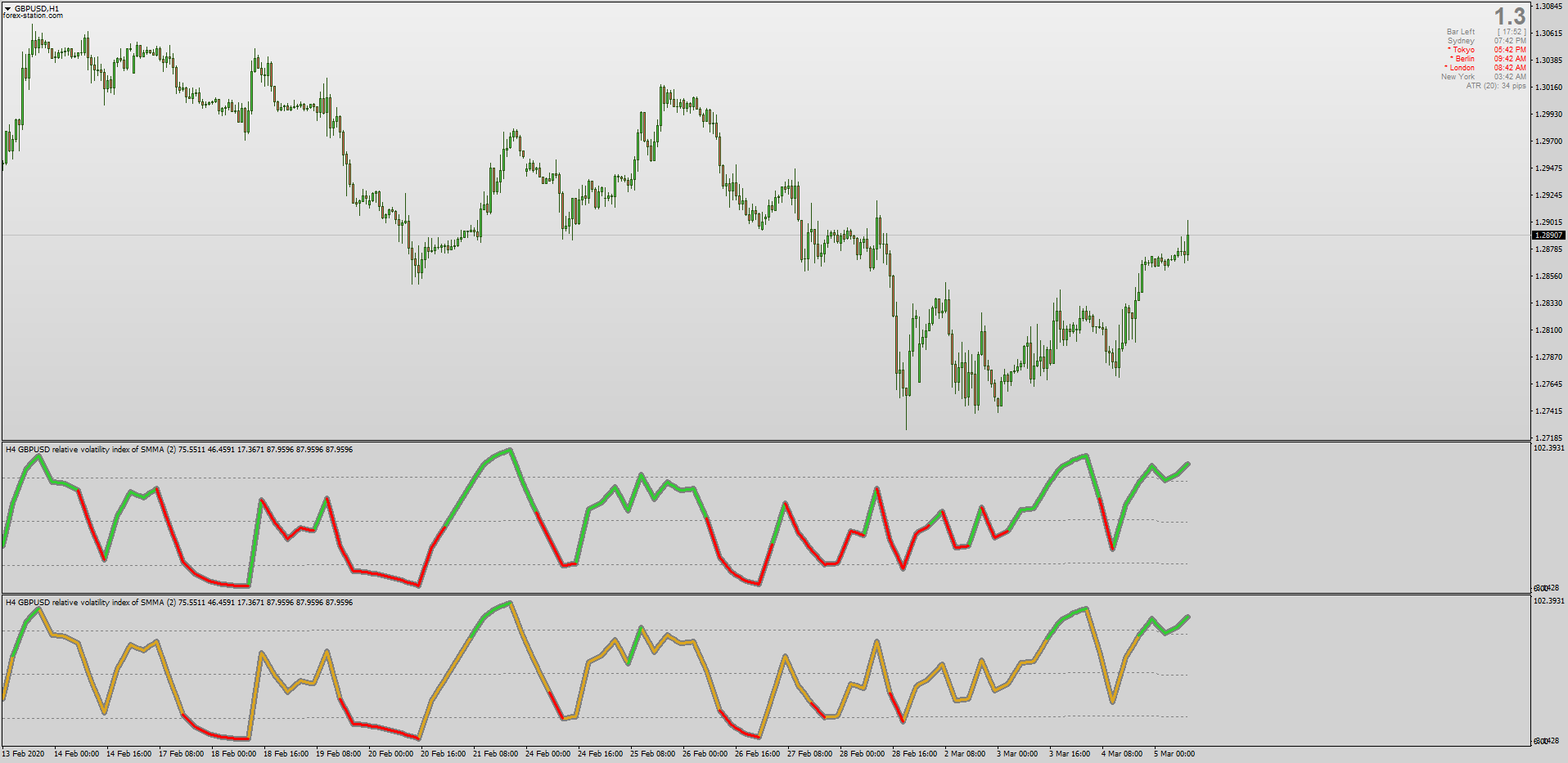 In 1993 Donald Dorsey created the RVI (Relative Volatility Index) to interpret volatility direction by using Standard Deviation price changes instead of absolute price changes (RSI). Mrtools' version for MT4 adds new deviation options & much more: viewtopic.php?p=1295404955#p1295404955