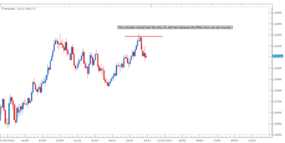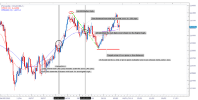 To automatically find the low/high of the cycle whence calculate the distance, the indicator calculate the lower/higher price from the date where centered moving averages crossed for the first time to the current cross.