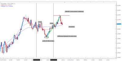 The cyclical theory that I know says that the fast centered moving average crosses the slow centered moving average at the halfway of the cycle, so if we measure the distance from the last low/high of the cycle to the price where the centered moving averages crossed we can add/get out this value to the crossover price and see where price theoretically will do its cycle high/low.