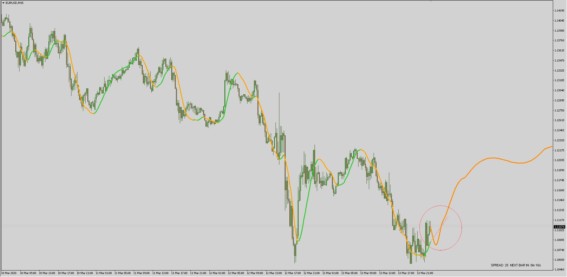 For example, here is a chart of the current EURUSD M15 with the Mladen's Holt_double_exponential_smoothing_2.2, the red dotted line projecting the price trajectory for the next couple of hours also on the same chart as a matter of comparison I have placed a Fourier Extrapolator represented by the solid orange bold line.