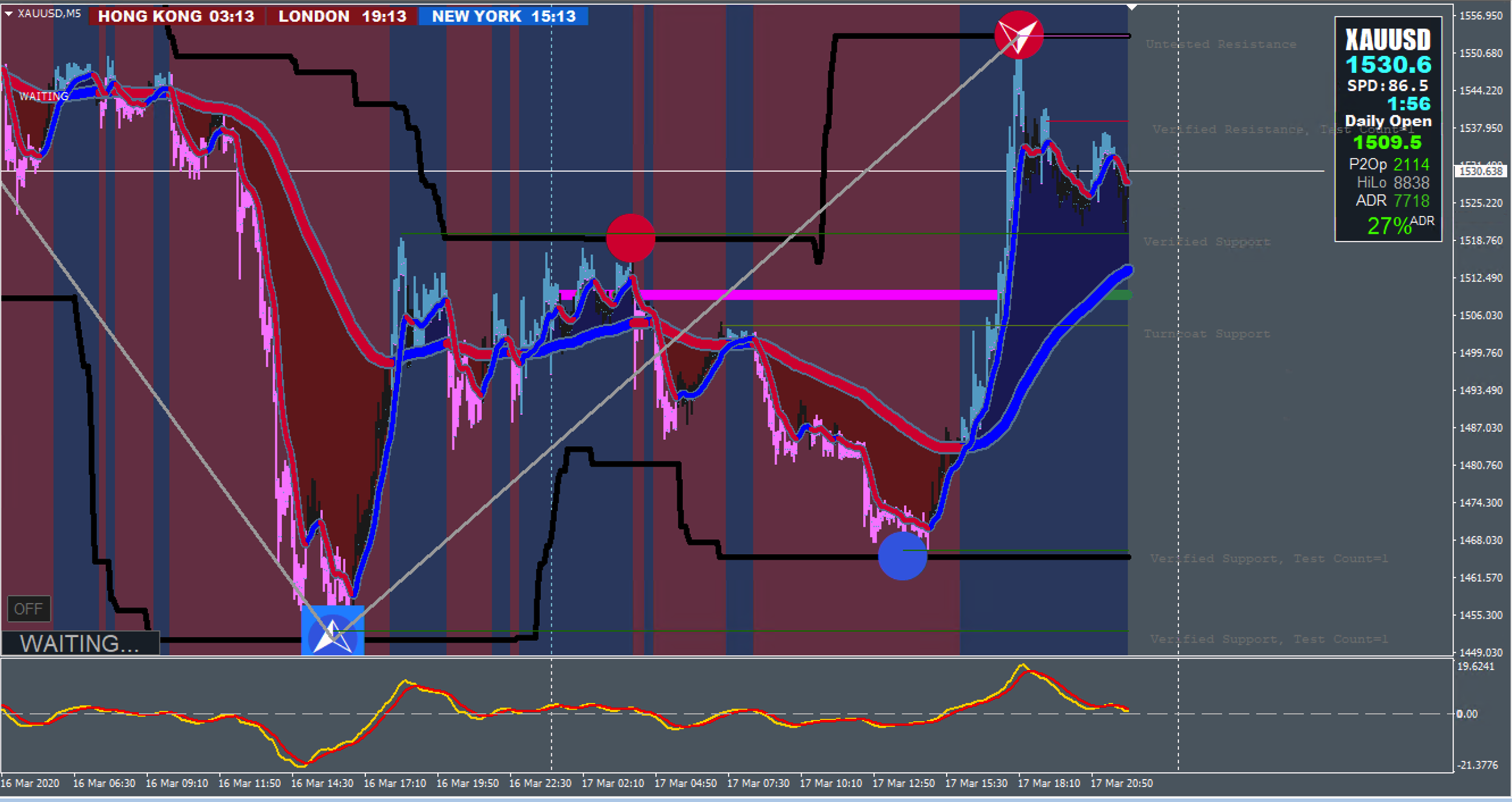 Check the 5 min chart. Search red or blue rectangle. If you see blue rectangle it means that the price reach its lower low on 4 hour chart. 2 things can happen its change direction or its will make another low and in this case the blue rectangle will repaint. So when you see the blue rectangle it means we are on low and its possible to go up. This up movement will confirm a 15 min blue dot with arrow or a simple 5 min blue dot. So if you see blue rectangle buy when you see blue dot with or without arrow and the background is going to blue. If you see red rectangle use the red dots with or without arrow to sell when the background goes to pink. Usually the red and blue dots will be the second dots.