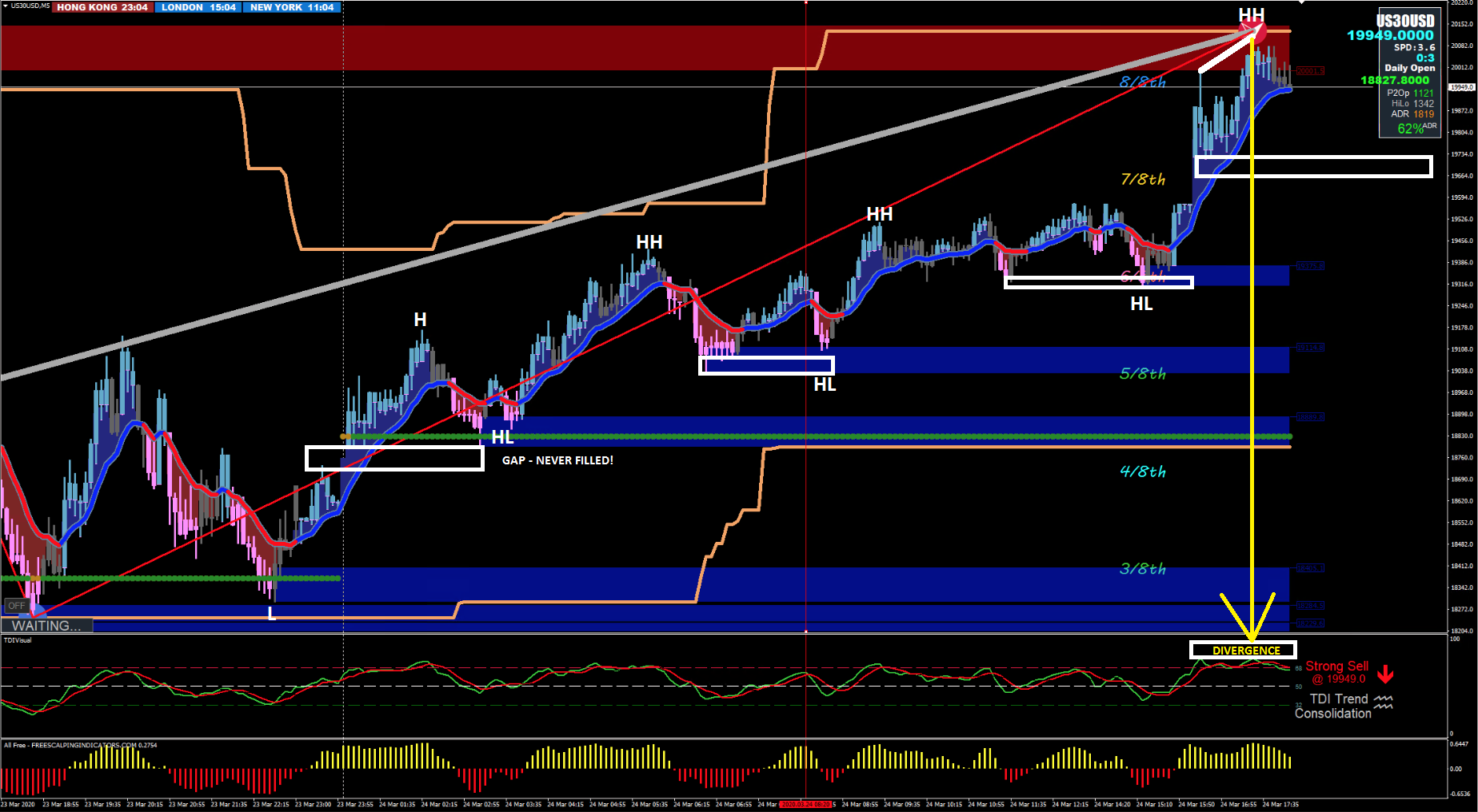 While doing this, OBSERVE the TDI but do not trade it – use it in conjunction with the trend MA and candle colours. As with all RSI based indicators, NOTE that PRICE is bullish when the green line is above zero and bearish when below zero. Also note that it will, at times, DIVERGE from PRICE as it is doing on the last 11 candles.
