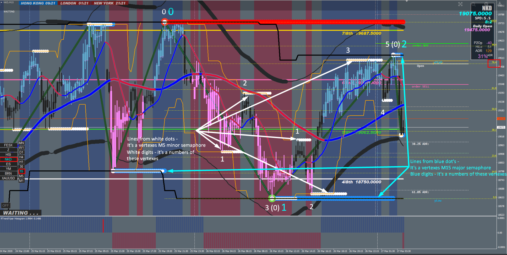 In this case, I considered Nikkei’s sales on the M15 TF. Accordingly, we are guided by the blue lines and numbers. Any position opening on any timeframe starts from the number 2. This is the main rule !. The picture shows that peak 2 (blue) has formed and you can begin to consider the entrance to the sale. Further, in post number 25, I explained why I refused to sell. Extreme Spike indicator saved me from the wrong entry, which showed further price behavior.