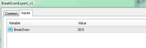 In the figure above, note that “Breakeven=30” simple means that this expert advisor will move your stop loss to breakeven once 30 pips profit has been achieved.