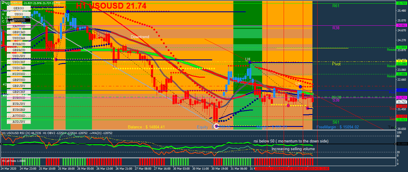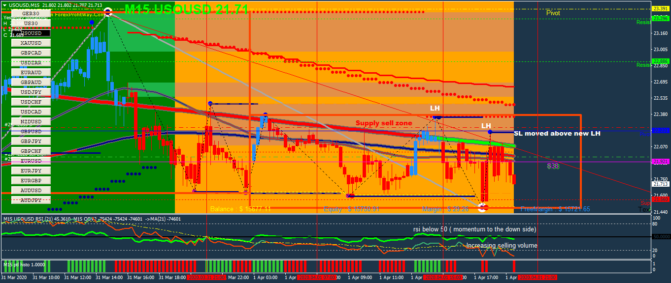Thanks Josi.. i will take explain as best as I can.. Yes with Oil I took into account some fundamentals with demand been on global lows since most airlines are not operating at the moment due to the Coronavirus...Ina addtion, the main technicals i had to go with on the 1 hour time frame suggested a continuation of the downtrend...I cannot stress how effective the 200ma is in acting as a trend guide or your trend line so to speak...Basically i had all my emas been above price after new LH was set and also to note was the rsi level (momentum been below 50) with increasing selling average volume ( OBV )...Based on the above indications; i then looked for sell opportunities.. Price likely to fall to previous low around price level 21.01josi wrote: Thu Apr 02, 2020 1:20 am