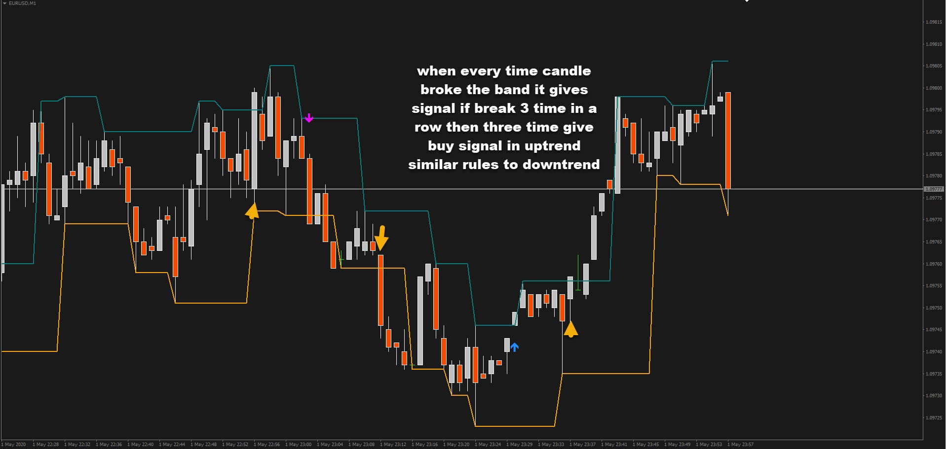 Now in current situation only give one signal in one direction after breakout, but I will like it to change when every time candle broke the band it gives signal if break 3 time in a row then three time give buy signal in uptrend and similar rules to down trend.