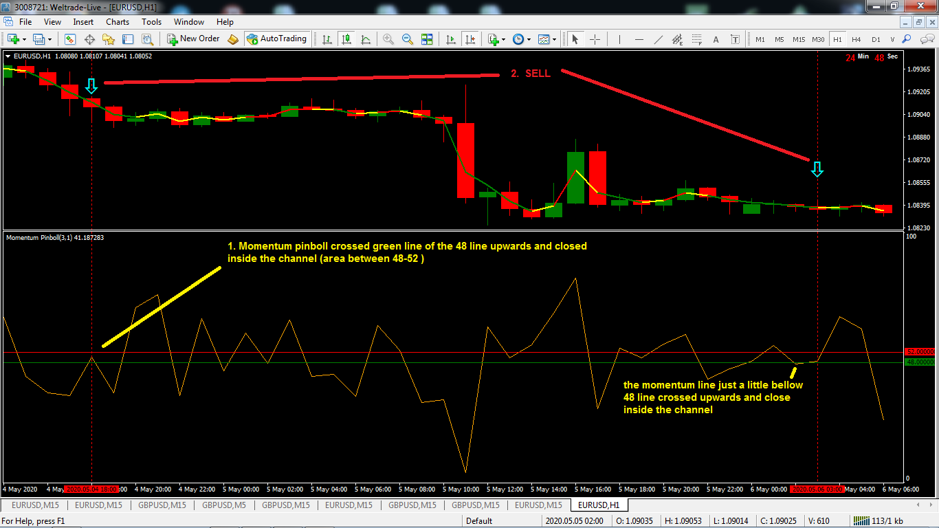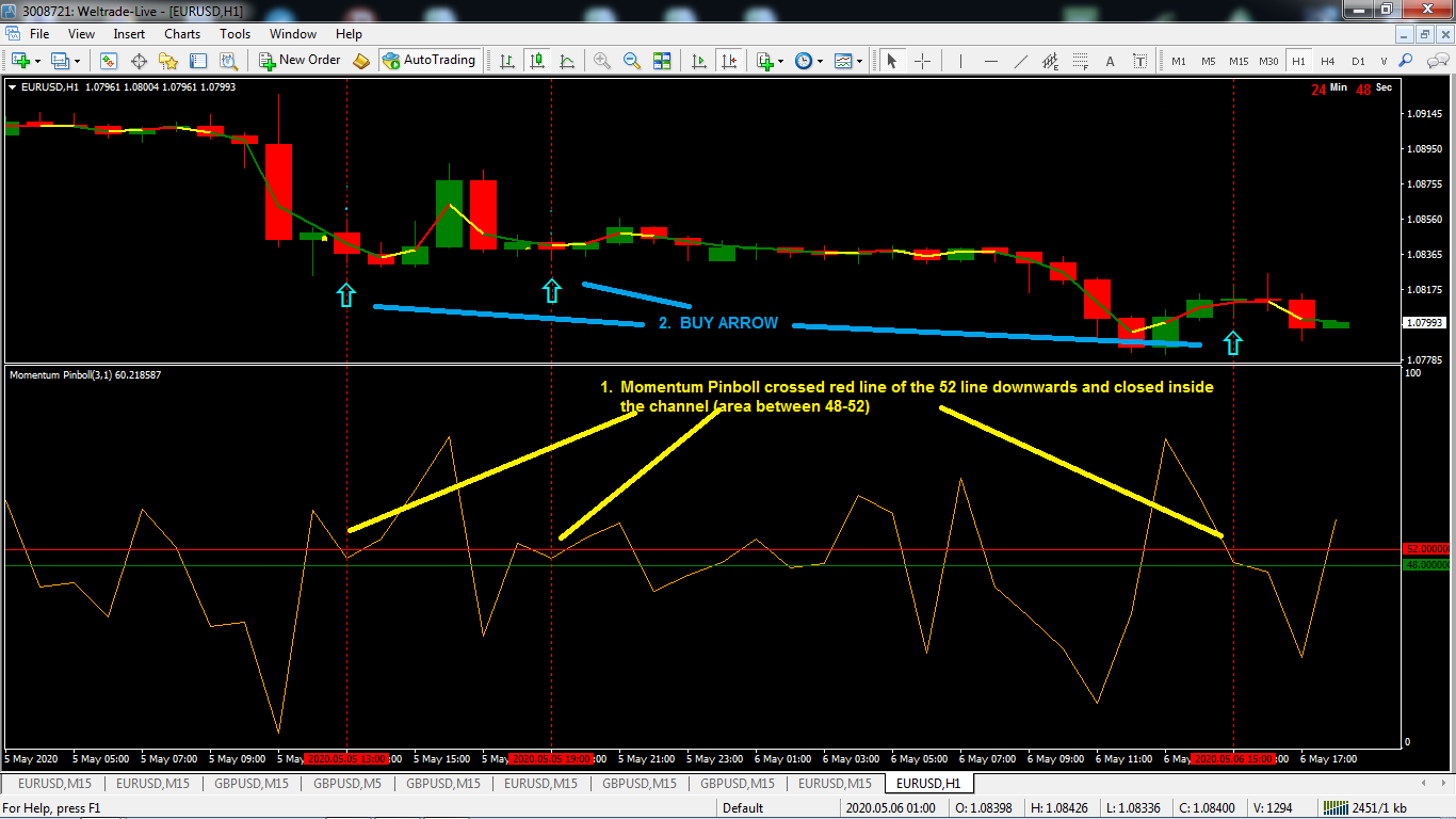 Can you please make the arow comes out already when the momentum pinboll line already crossed in between 48-52 line, so it will be an early warning to take a position after the closed candle.