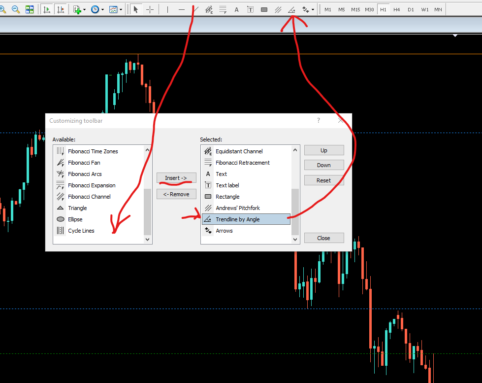 Right click on the tool bar section, select customize > and select Trendline by Angle, insert to list and then select from the toolbar and use as per trendline tool but against the MA instead.